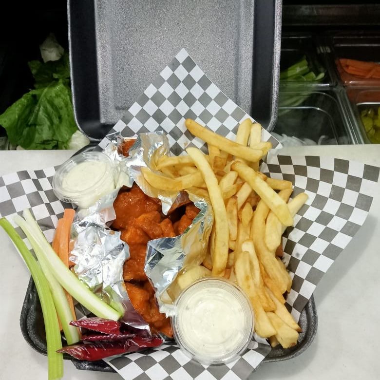 Incluye, papás fritas, zanahoria y apio, y 6 oz de Ranch.