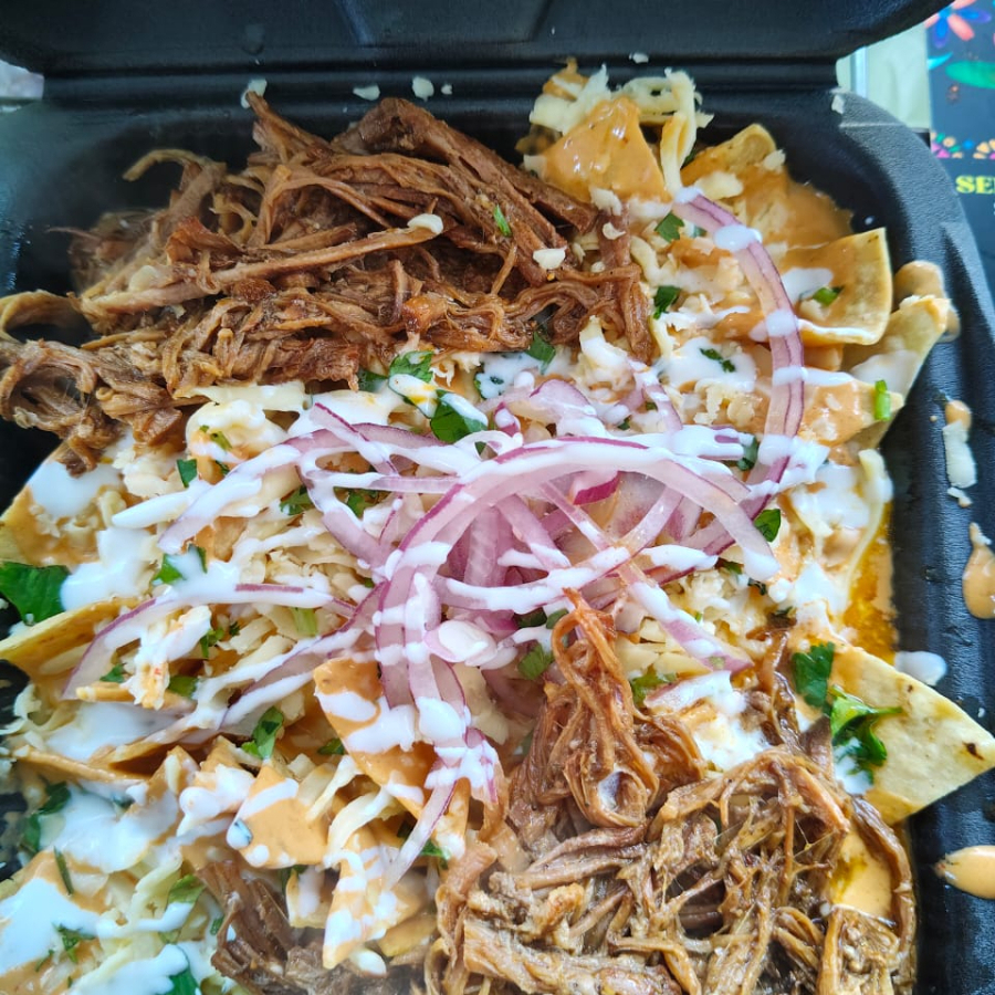 Carne de puerco estilo yucatán, queso fundido. acompañado de cebolla encurtida con habanero, papas caseras y salsa de árbol.