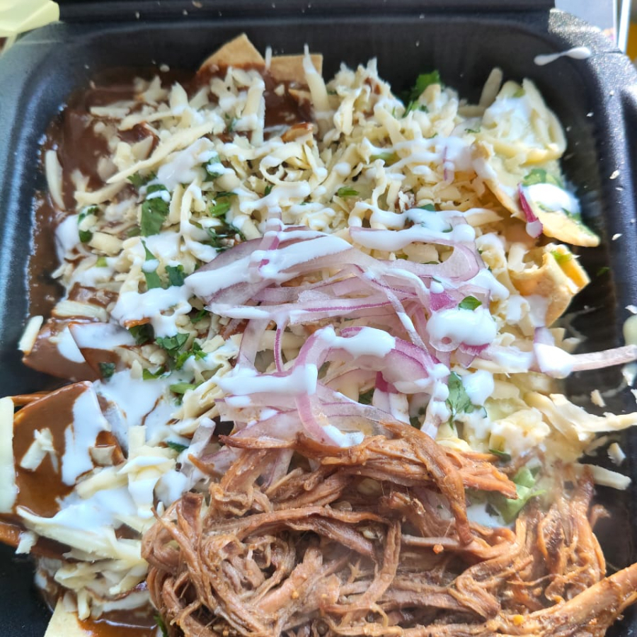Chilaquiles con queso, proteina a elegir, cebolla, cilantro, crema, salsa de mole doña maria, un toque de la casa entre dulce y picoso.