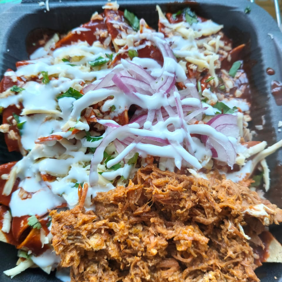 Chilaquiles con proteina a elegir, crema, cebolla, cilantro, queso, salsa de chile morita y chile puya.
