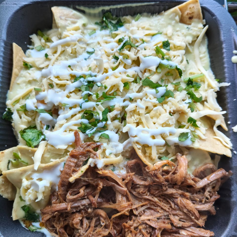 Chilaquiles con proteina a elegir, cebolla, cilantro, queso, mezcla de de chiles jalapeños, queso philadelphia, crema acida.
