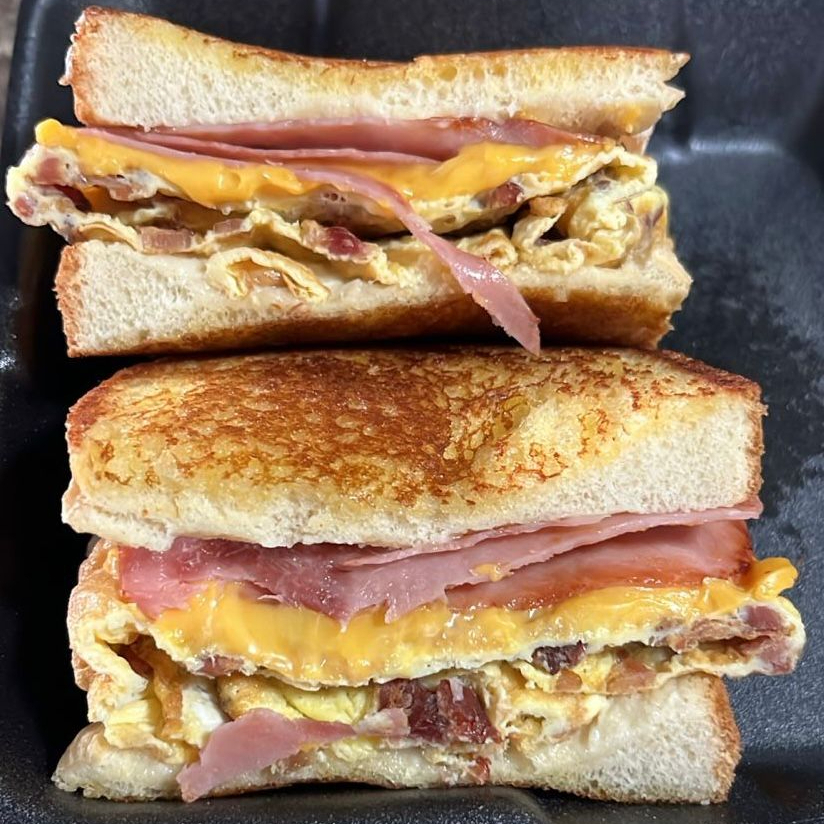 Omelette de 3 huevos con queso fundido y tocino con una camita de jamón de pierna. acompañado de papas caseras y chile curtido.