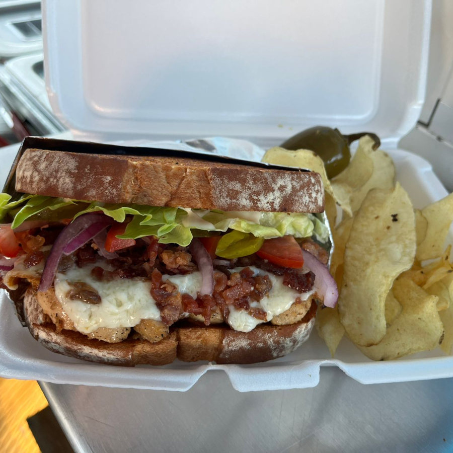 Pechuga de pollo a la plancha con un toque de miel mango habanero, pan dorado en mantequilla, pepinillos, cebolla morada, tomate, lechuga y mayonesa, acompañado de papas caseras y chile curtido.
