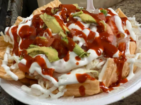 Tostaditas de maíz enchilado, con repollo, tomate, cueritos, aguacate, con salsa picante y crema.