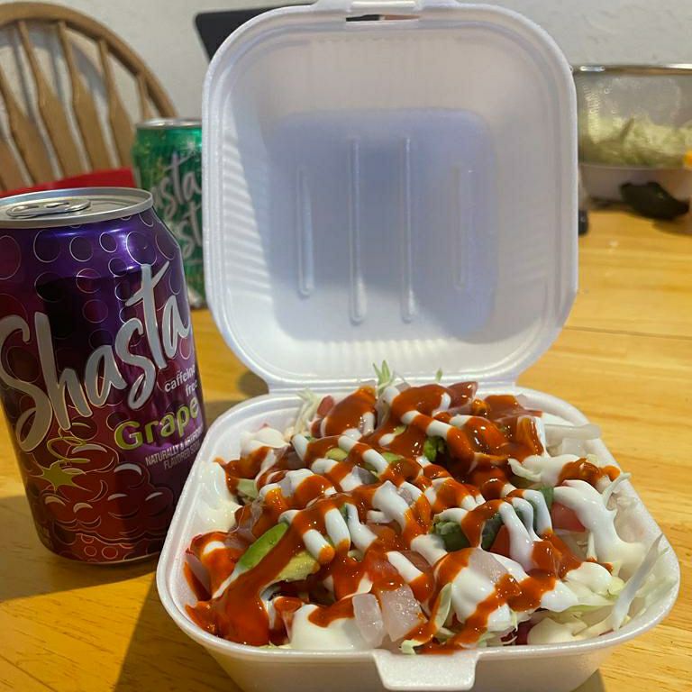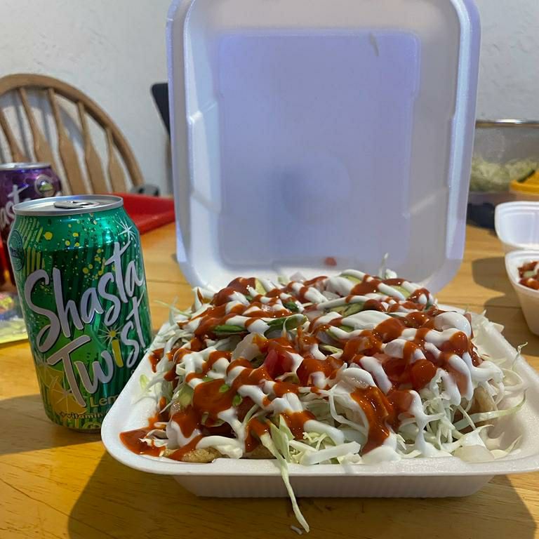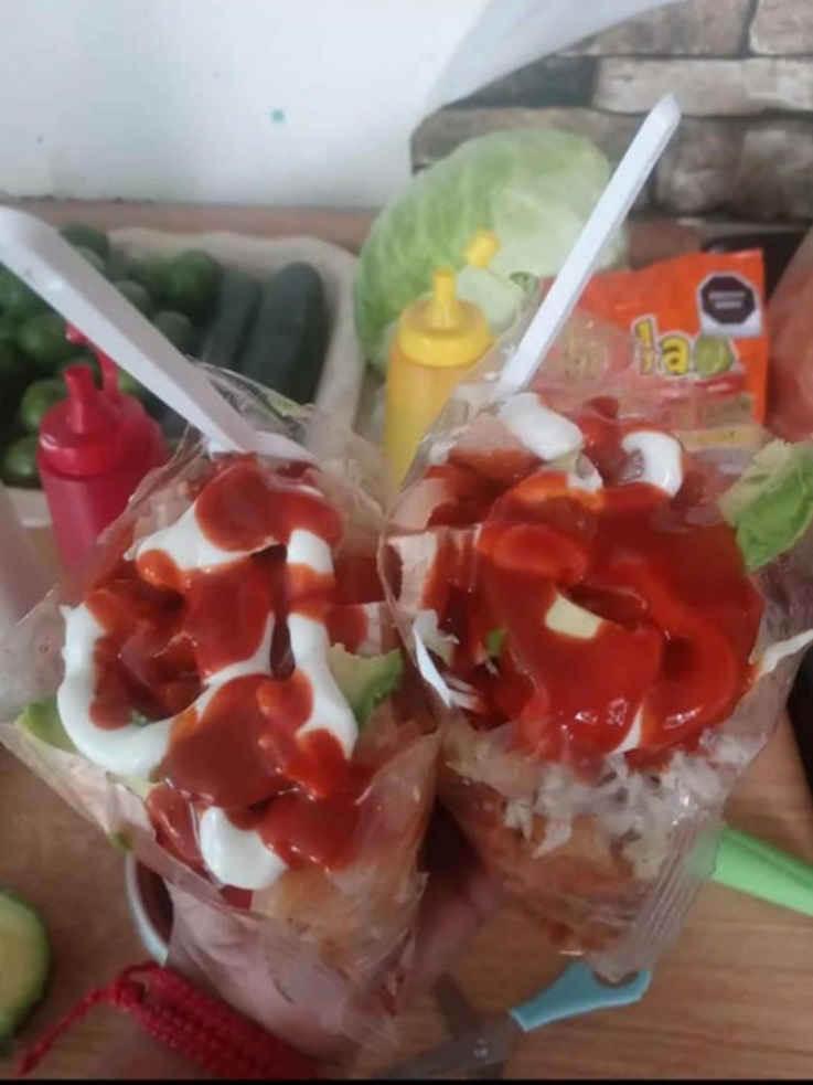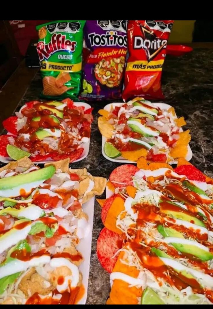 Sabritas de tu elección, preparadas con repollo, tomate, cuerito, aguacate, salsa picante y crema.