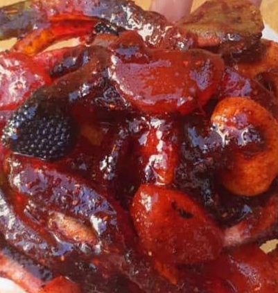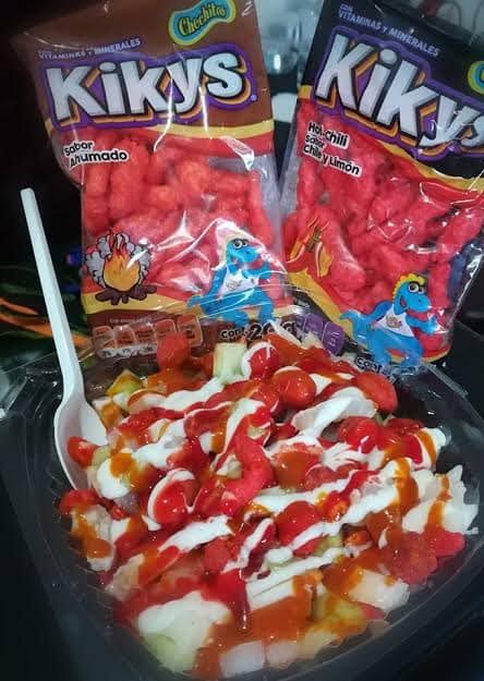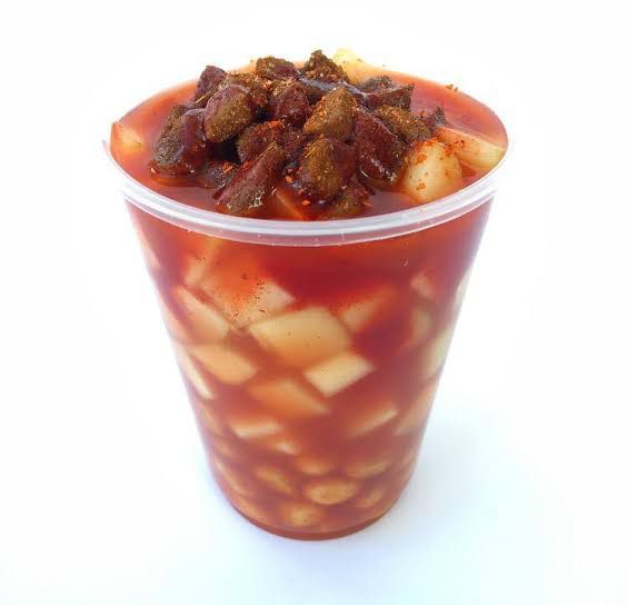 Tostaditas enchiladas, con cacahuates, cueritos, rollitos de tamarindo, clamato, aguacate, salsa picante y soya.