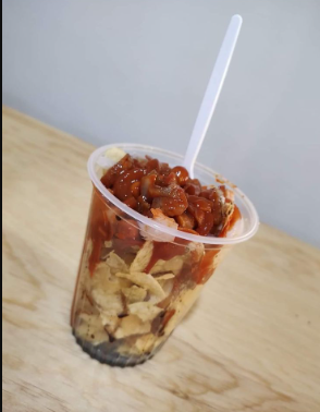 Cacahuates japoneses, con clamato, cueritos y churritos de tamarindo, salsa picante y soya.