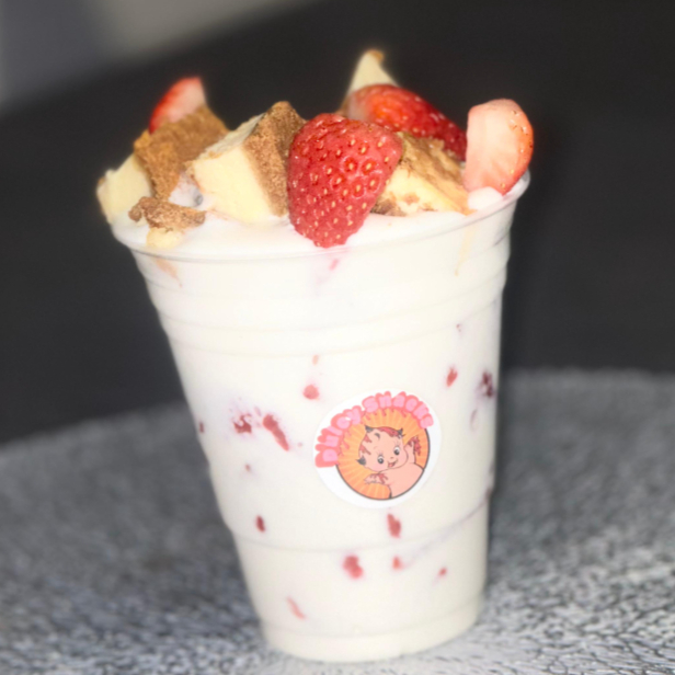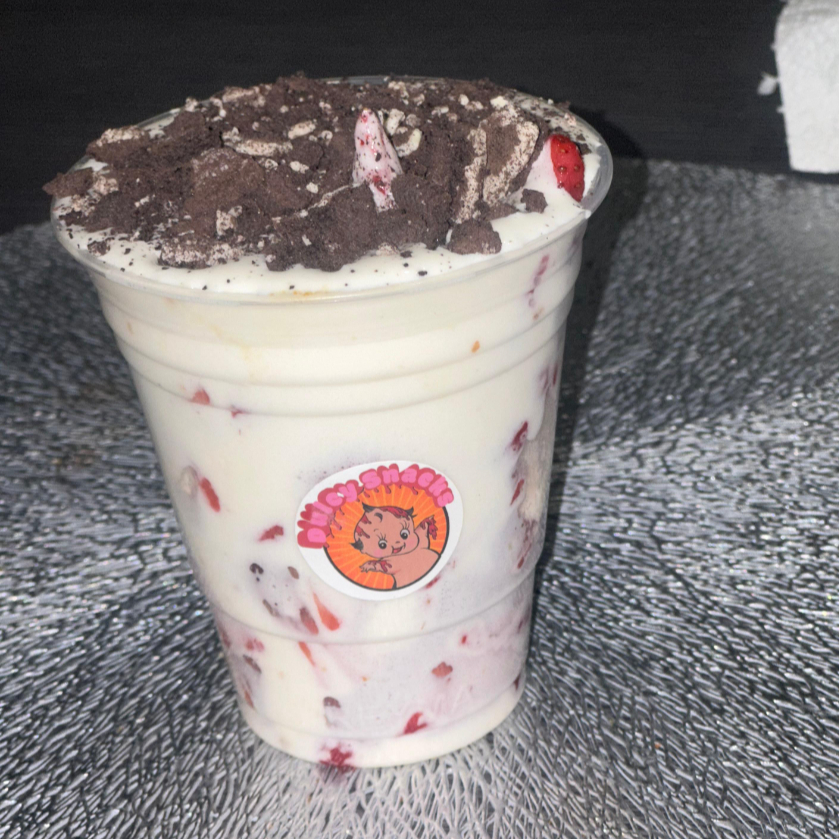 Fresa fresca con crema casera y pay en vaso de medio litro