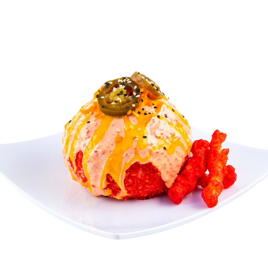 Fría, cubierta en Cheetos flamin' hot, salsa Buffalo-ranch, jalapeño, zanahoria rallada y ajonjolí