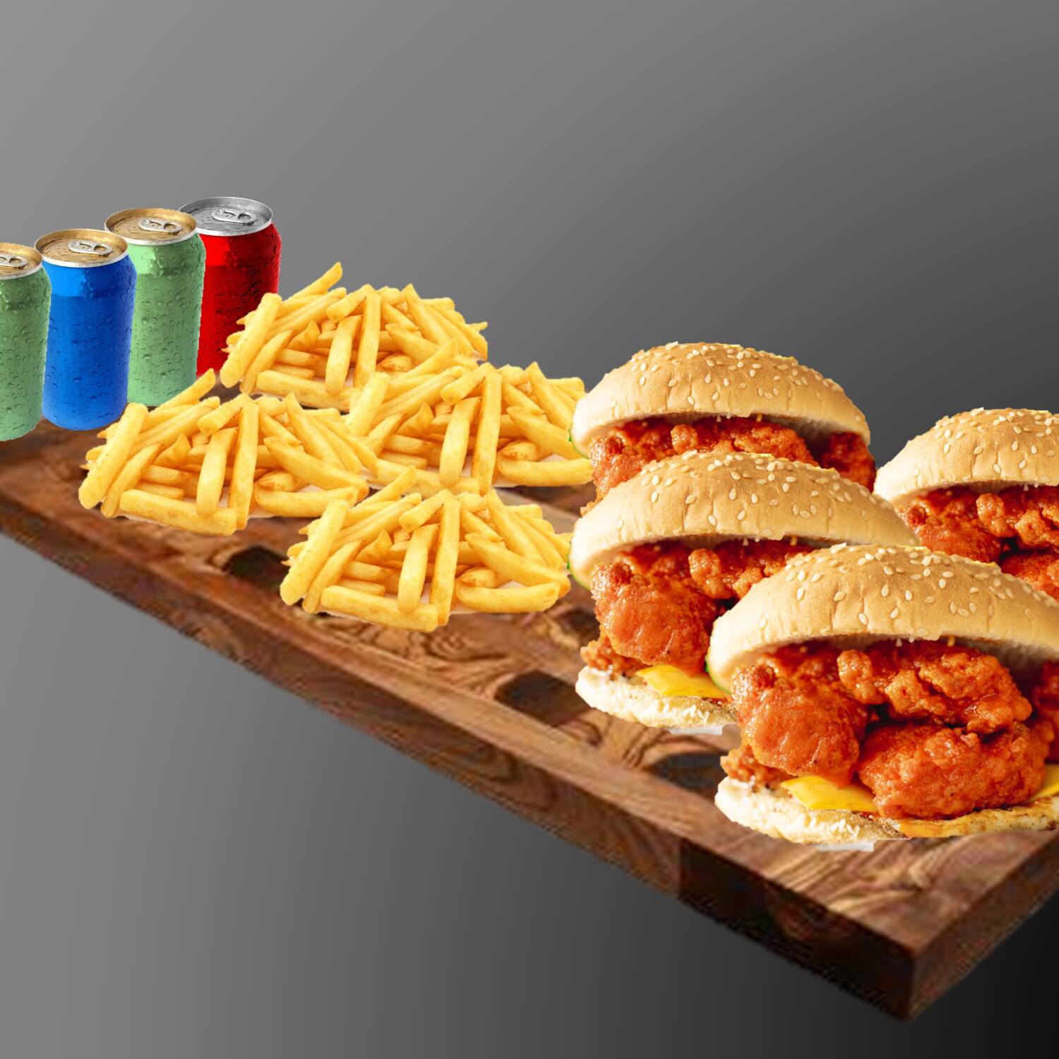 4 HAMBURGUESAS DE BONELESS PAPAS FRITAS Y SODA