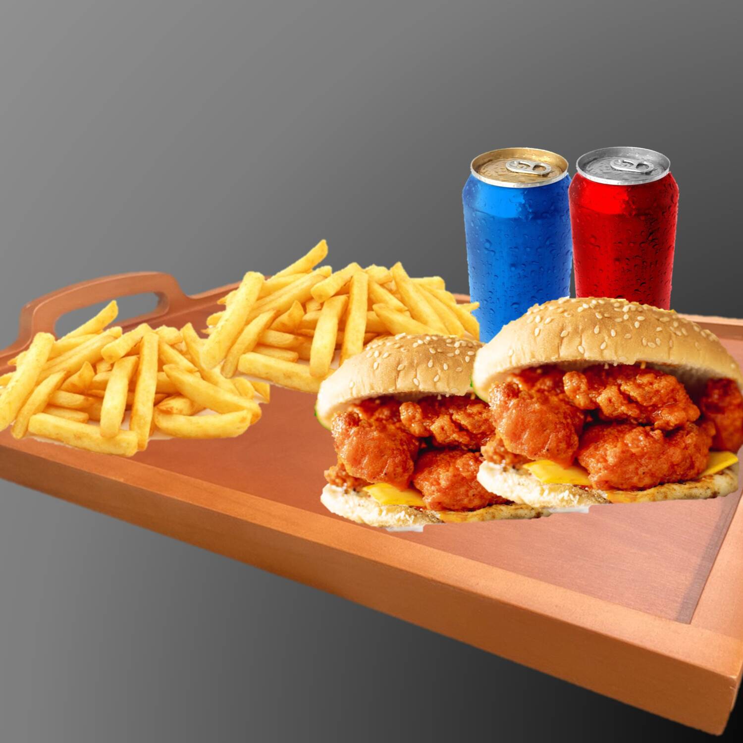 HAMBURGUESA DE BONELESS EN TU SALSA FAVORITA PAPAS FRITAS Y SODA