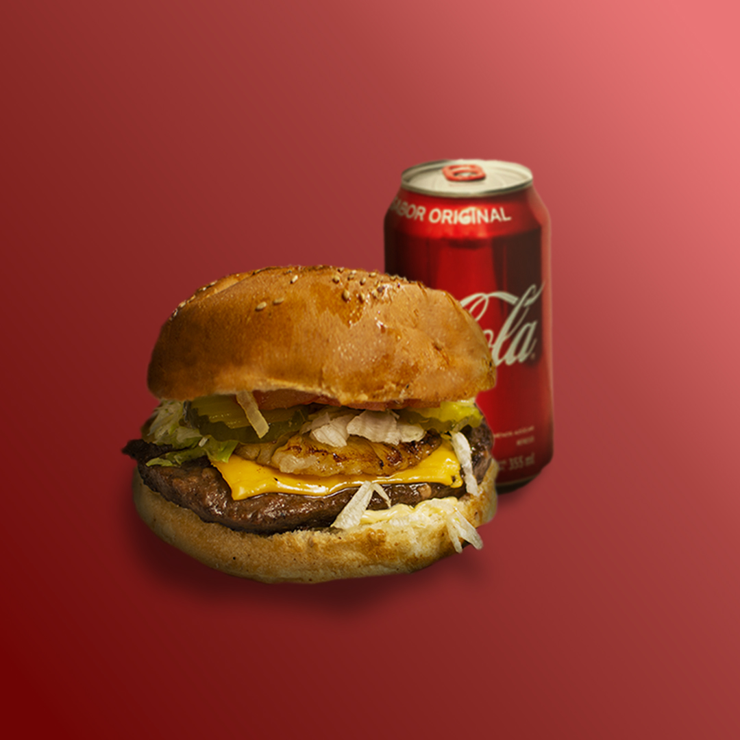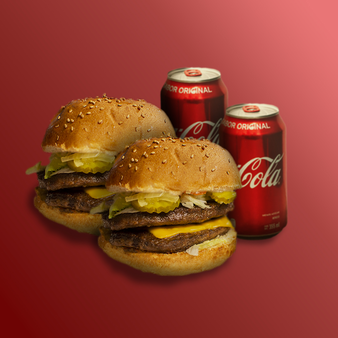 2 Hamburguesas sencillas con carne de res, queso amarillo, lechuga, cebolla guisada con mostaza, tomate, pepinillos, salsa soya, mayonesa, mostaza y Kétchup más 2 latas de Coca Cola 355 ml.