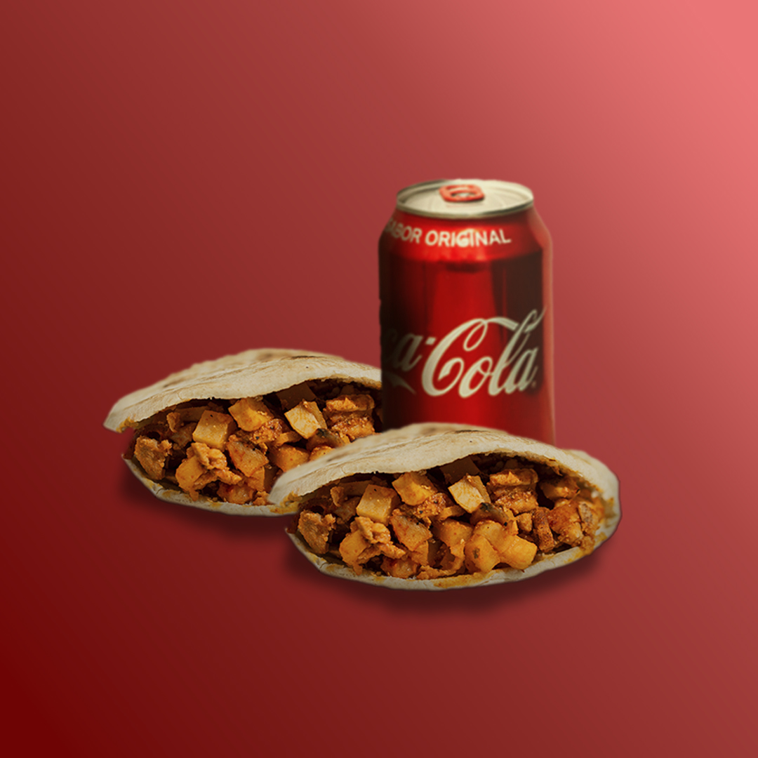 2 Gorditas de harina relleno de guisado 100 grs de tu preferencia más una lata de Coca Cola 355ml.