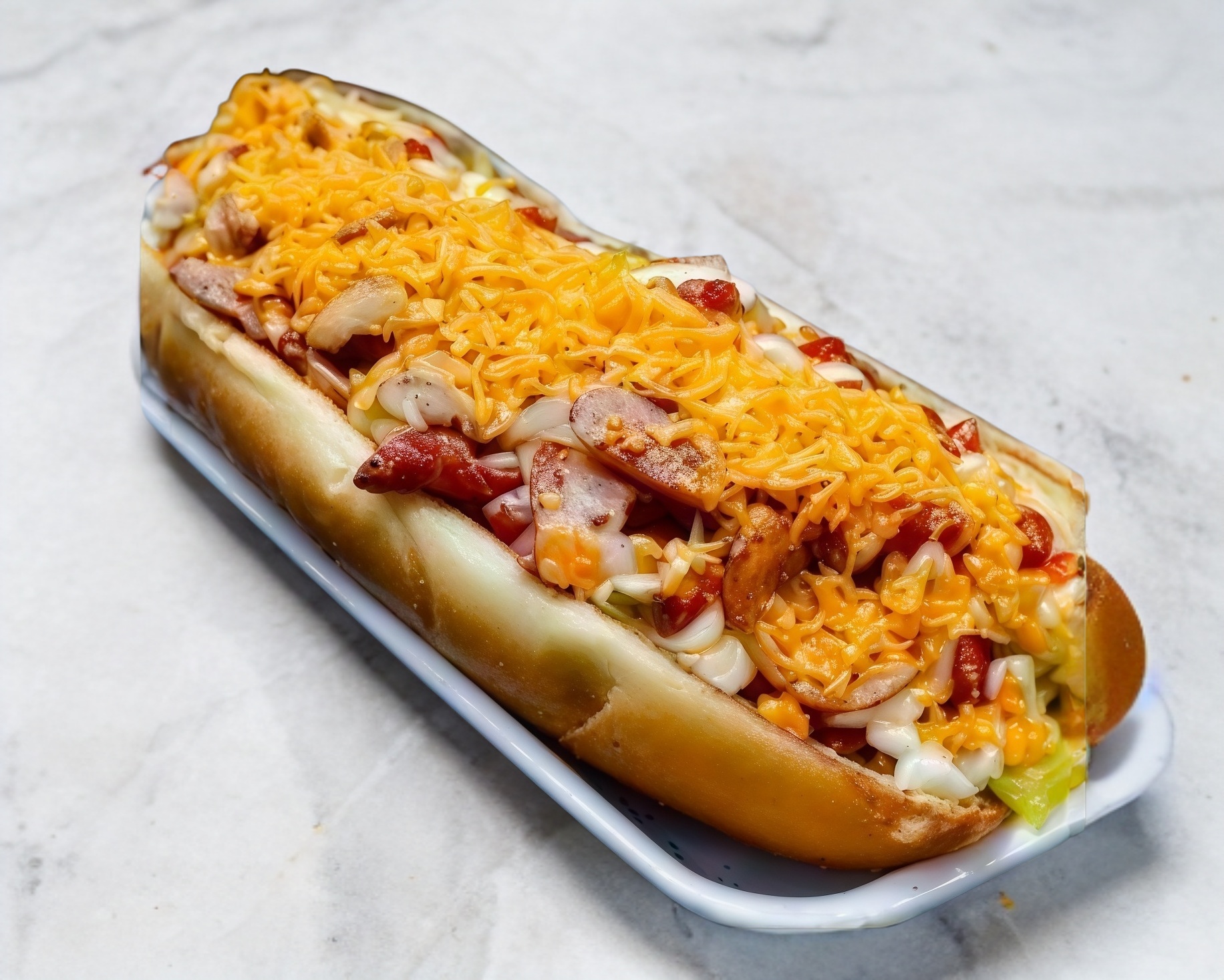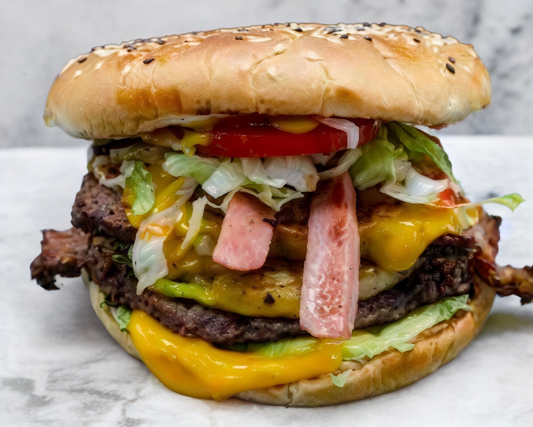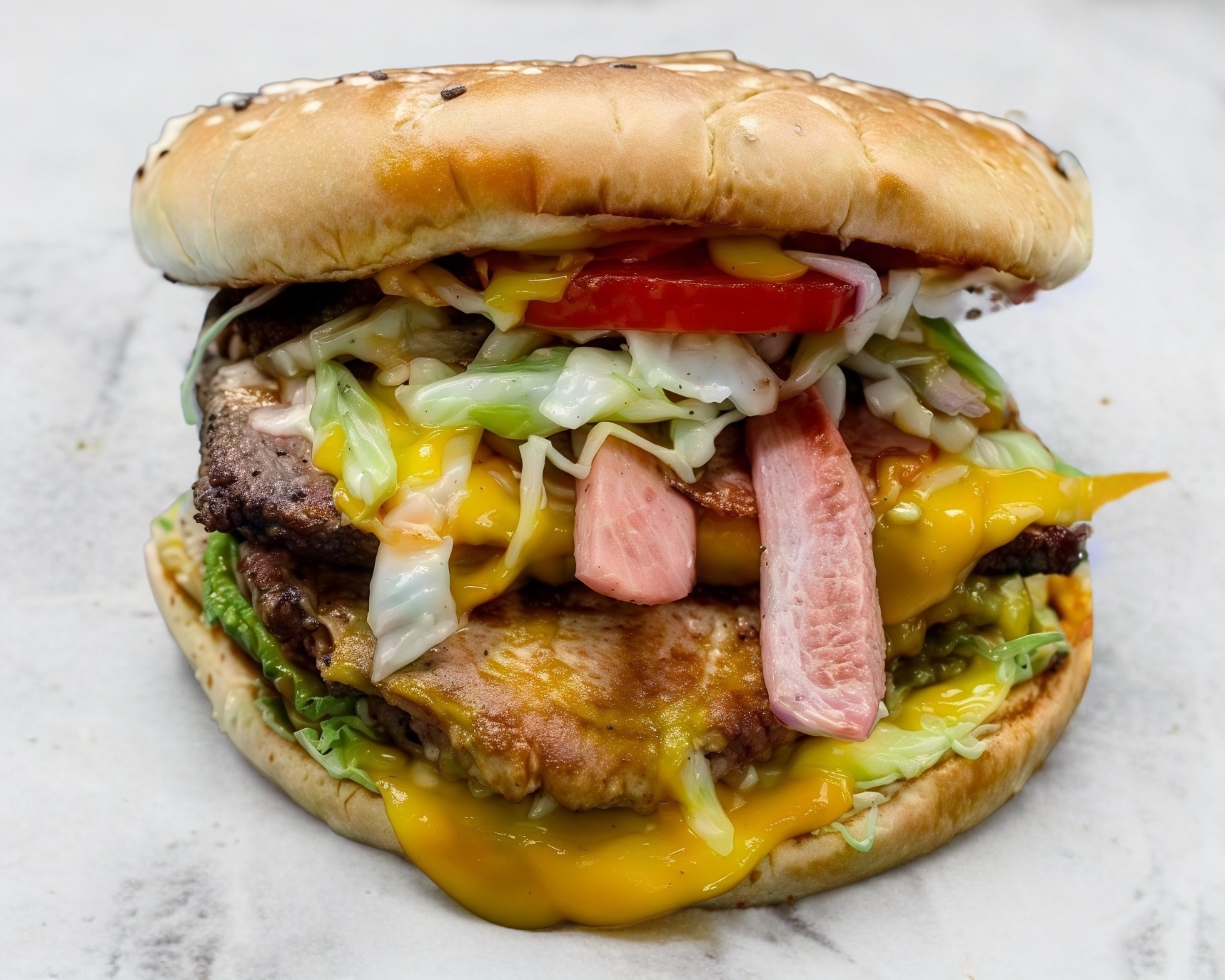 C. sirlon, tocino, winny, jamón, aguacate, queso amarillo, lechuga, tomate y líquidos.