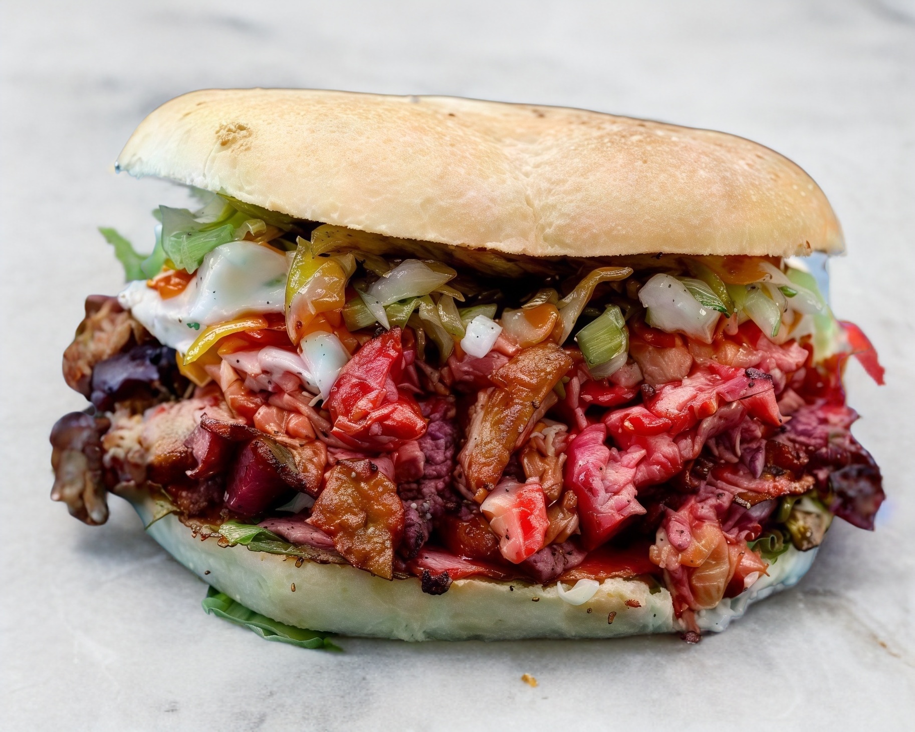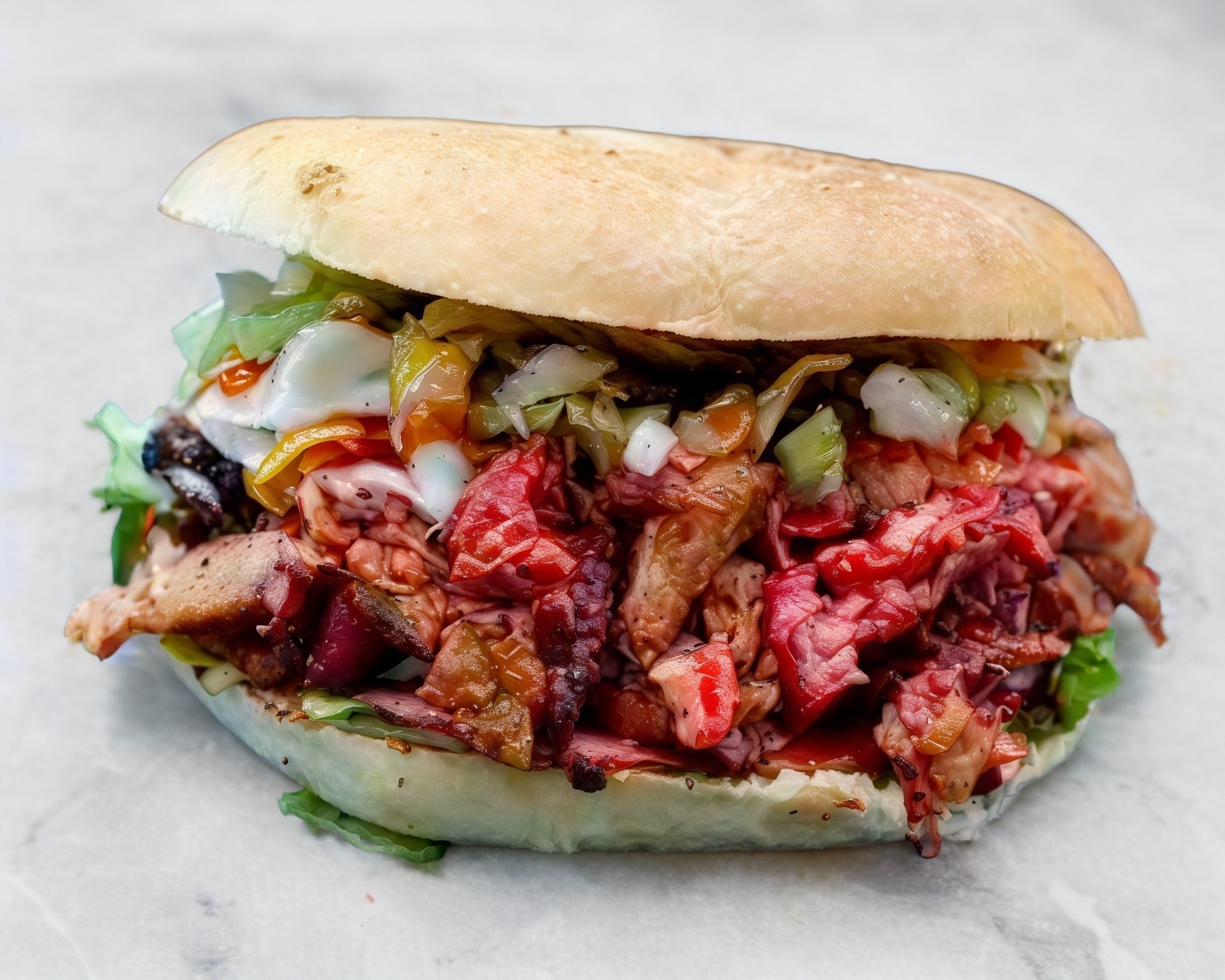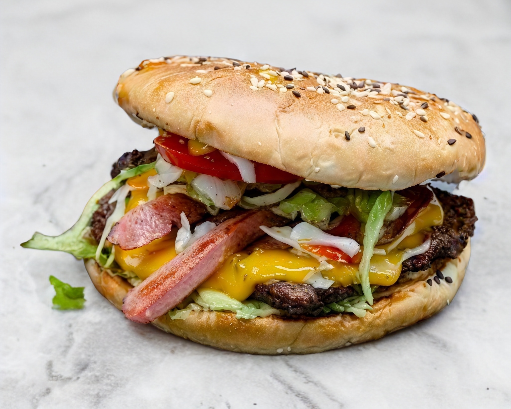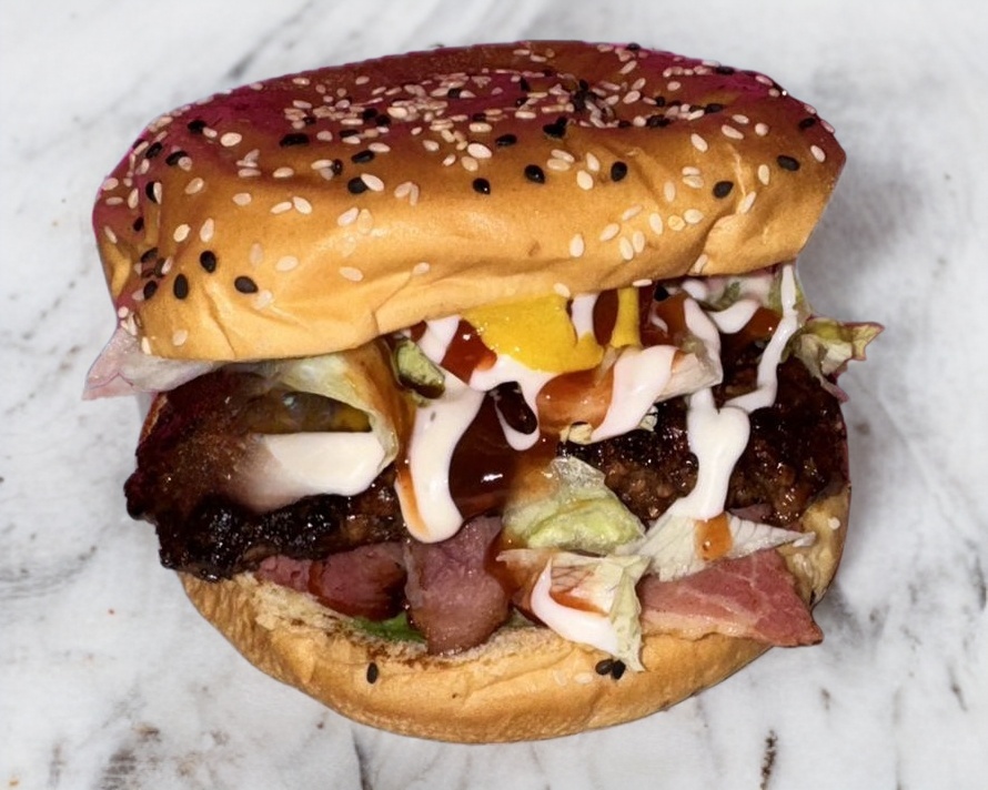 C. sirlon, tocino, winny, jamón, aguacate, queso amarillo, lechuga, tomate y líquidos.