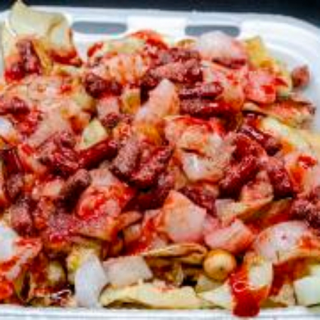 Papas fritas 200gr + 1 salchicha para asar picada+ queso amarillo+ salsas (Porción personal)