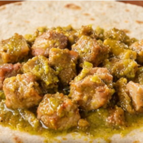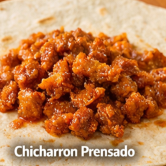Tortilla de harina, salsa verde, chicharrón prensado
