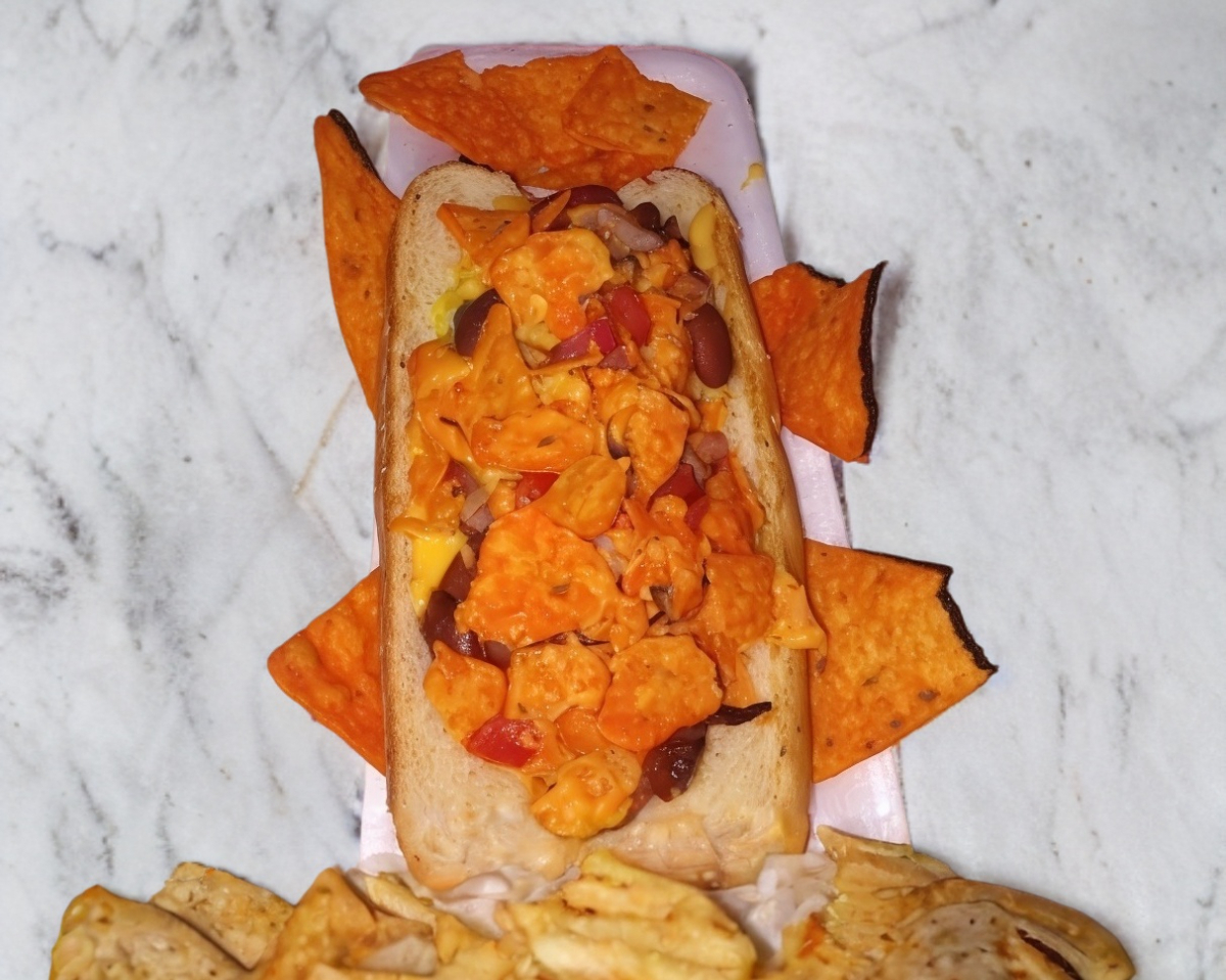 Frijoles tomate cebolla chiles curtidos pepinillo toxino queso chedar mayonesa moztasa capsu y doritos o rufles