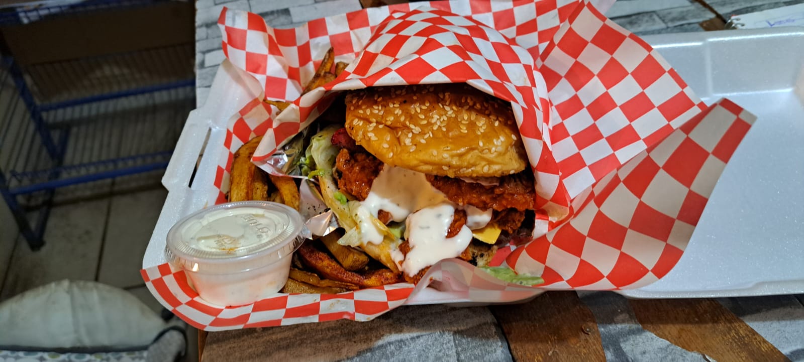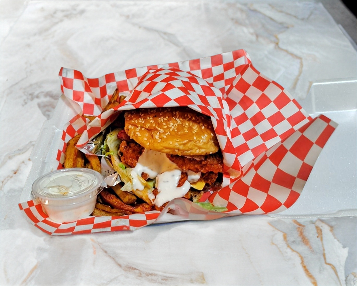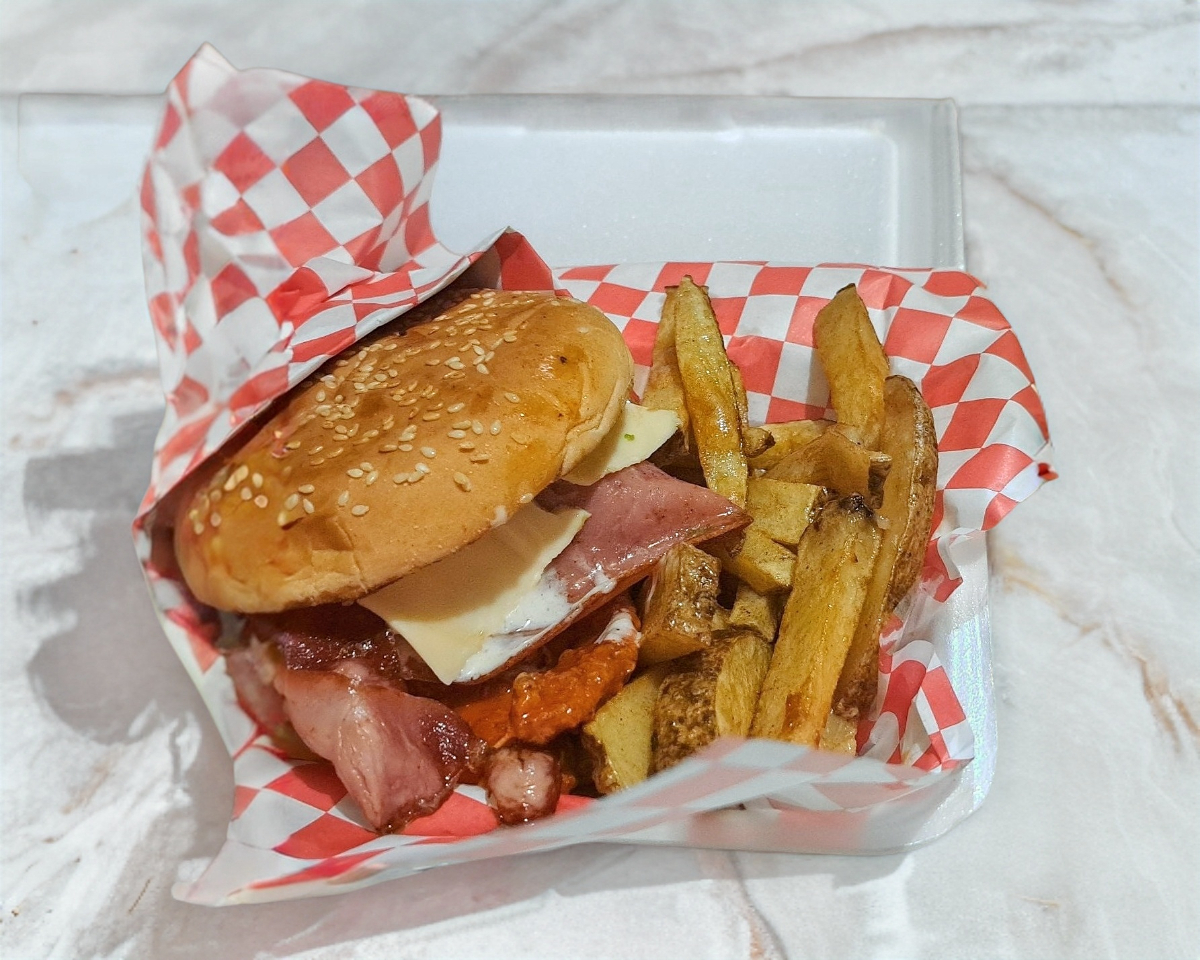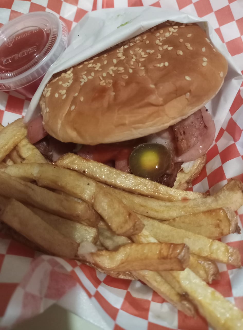 Una carne sirloin, pechuga natural bañada en salsa de tu preferencia, incluye papas, lechuga, aguacate, tocino, salchicha, jamón y mayonesa ranch.
