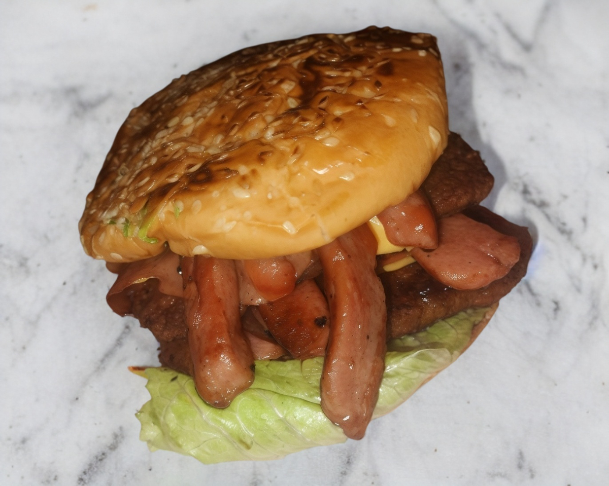 3 Carnes de sirloin, 3 capas de queso amarillo, 3 capas de salchicha, 3 capas de jamón, aguacate, lechuga, tomate, mayonesa y cátsup.