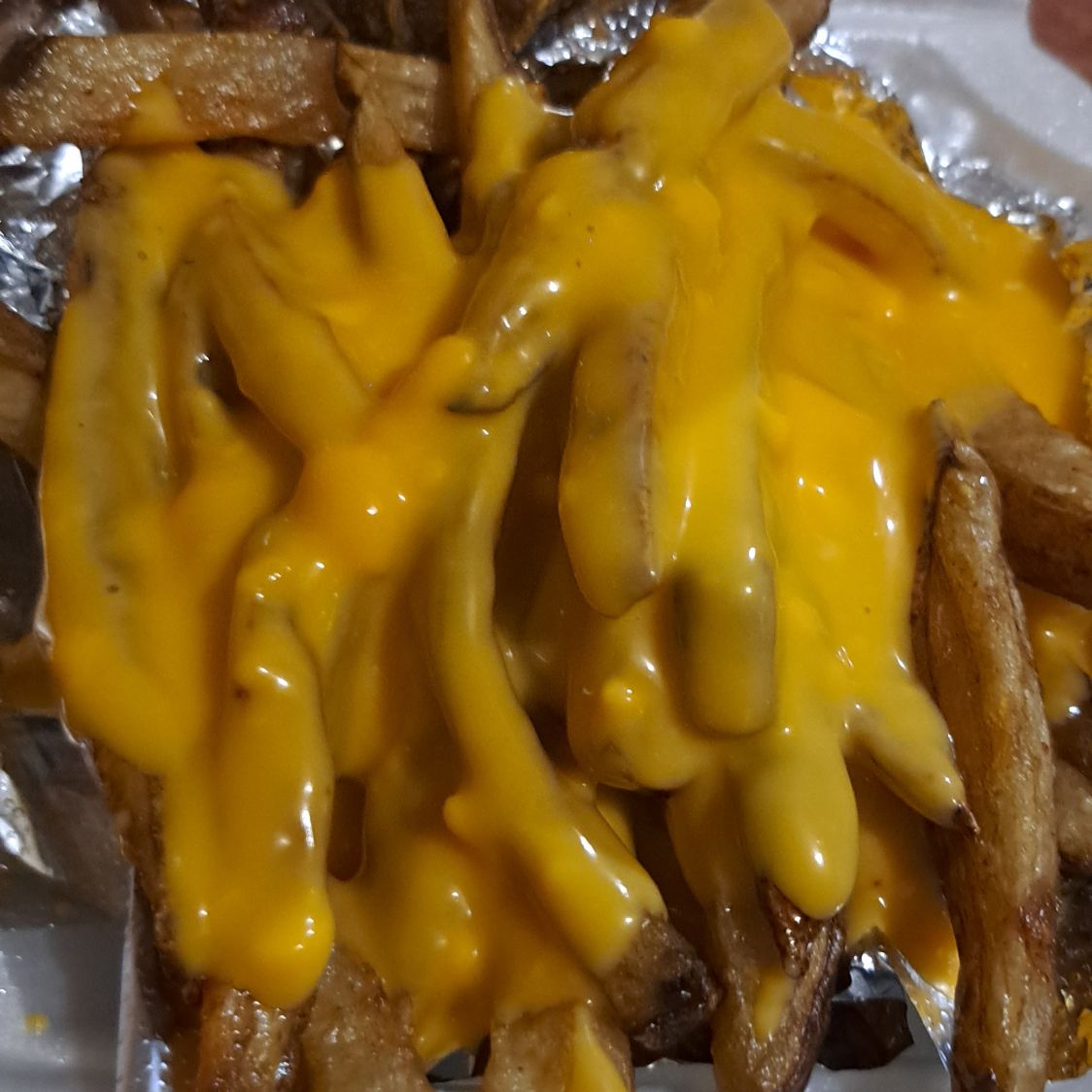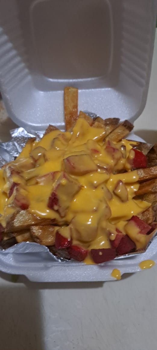 Porción de papas con queso amarillo.