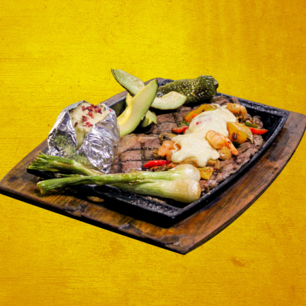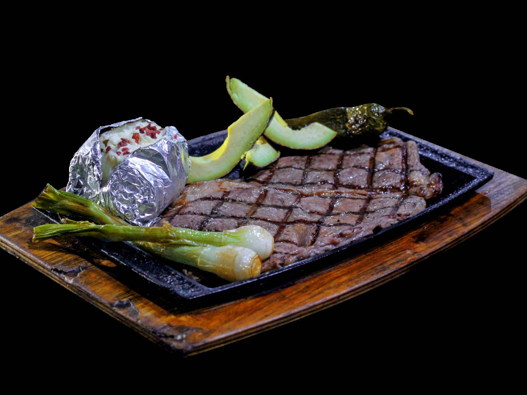 Al grill, acompañado de papa asada, aguacate, cebolla cambray y chile toreado