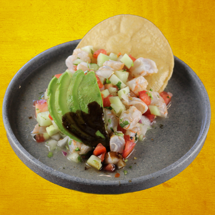Camarón crudo mezclado con tomate, pepino, cebolla y corona de aguacate.