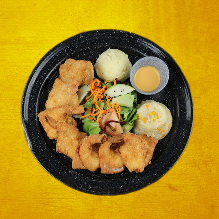Camarones rellenos de queso Philadelphia, empanizados y acompañados de ensalada verde, papa y arroz.
