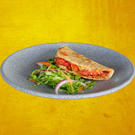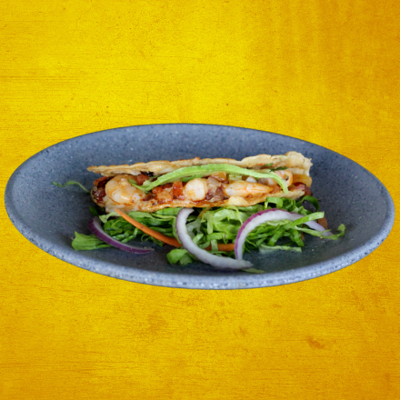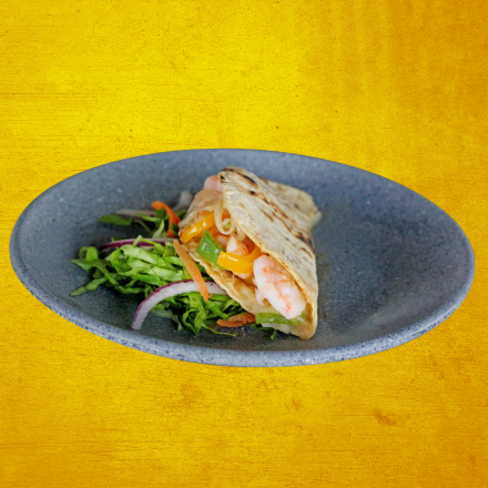 Guiso de camarón con morrón, montado en una tortilla de maíz.