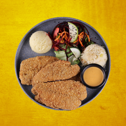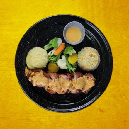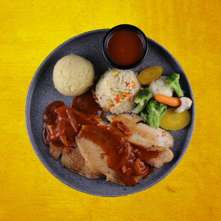 120 gr, bañados en salsa de chipotle, acompañados de arroz, puré de papa y vegetales.