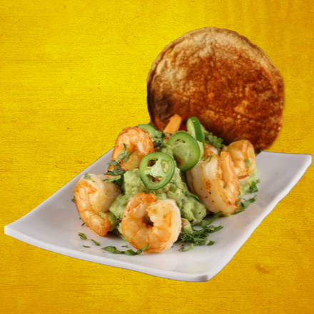 Puré de aguacate con serrano, cebolla, tomate y coronado con camarones salteados.