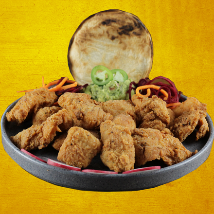 Sabroso filete de pescado frito, acompañado de guacamole y tortillas, servido en molcajete.