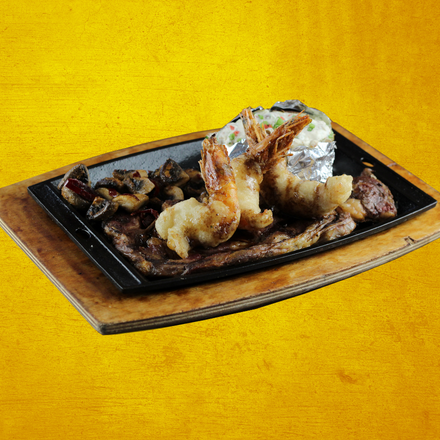 Acompañado de camarones tempura, champiñon al ajillo y papa asada.