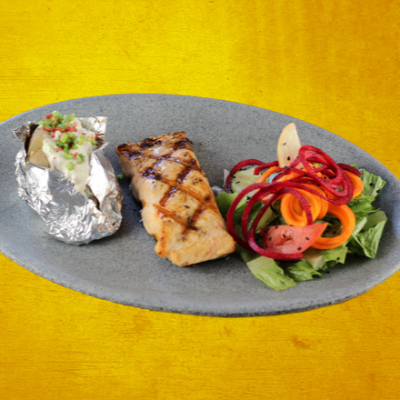 Salmón al grill, acompañado de ensalada fresca y papa asada