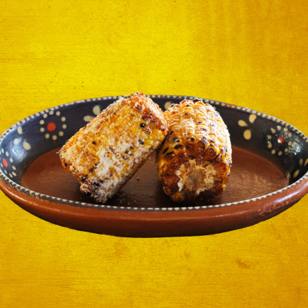Elote amarillo asado al grill, bañado con mantequilla y parmesano.