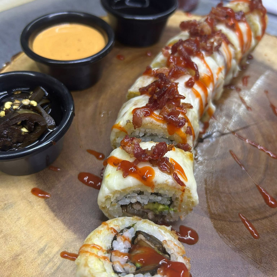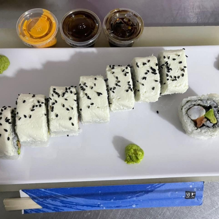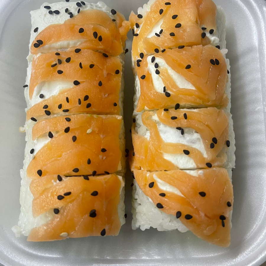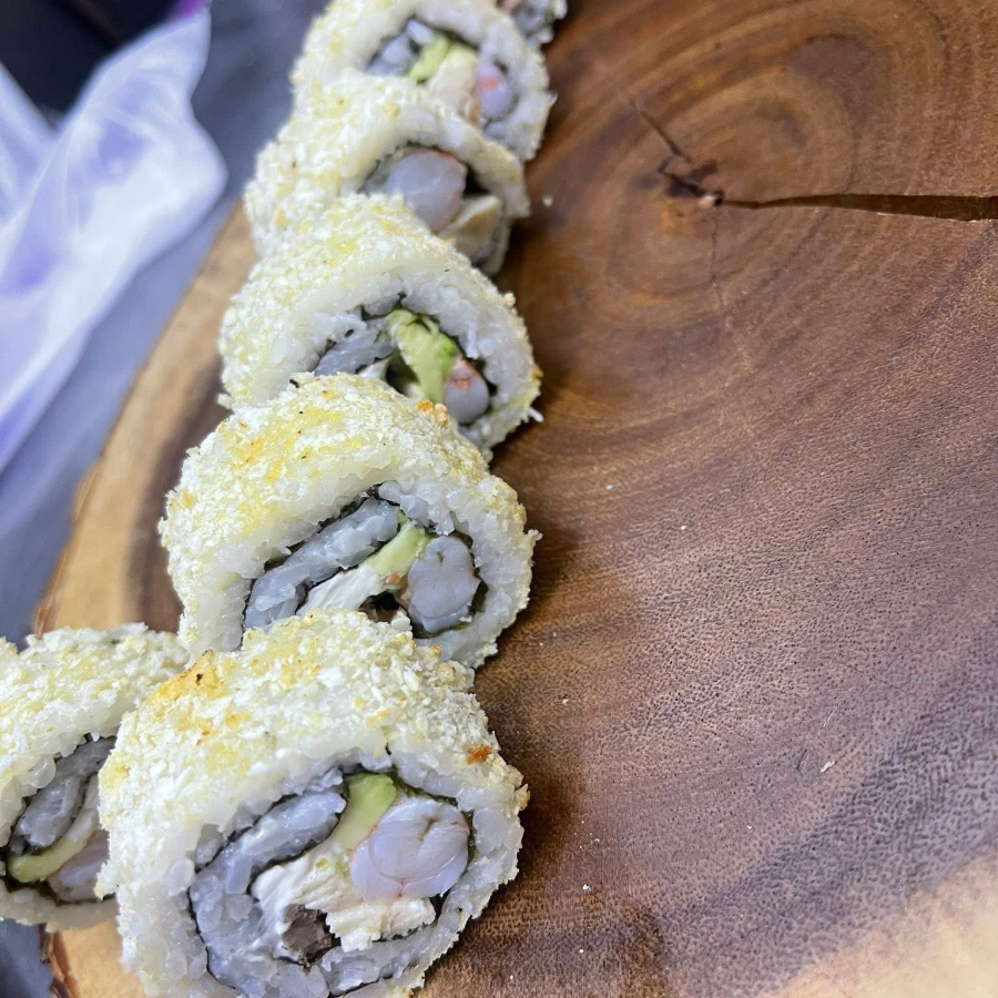 camaron , aguacate , salmon y una capa de queso crema por fuera