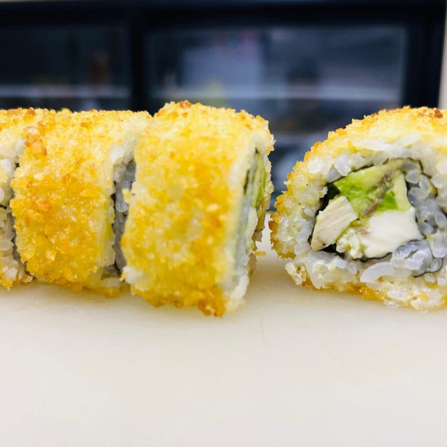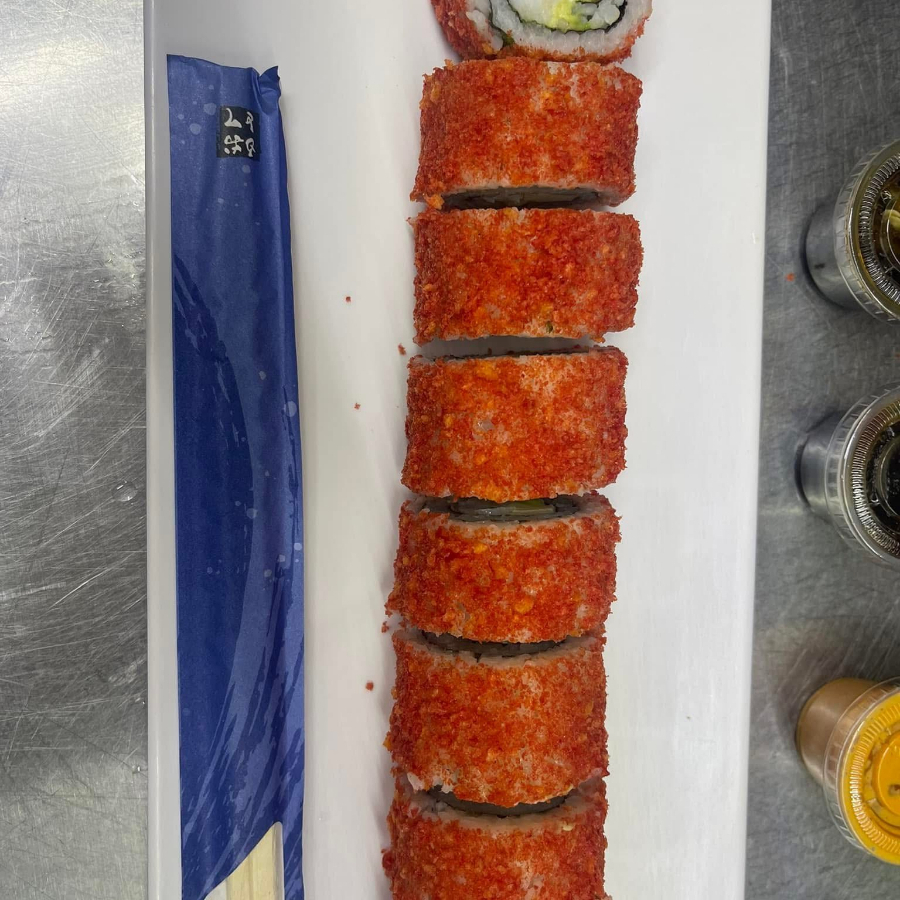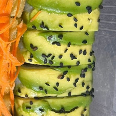 aguacate , pepino , queso crema , kanikama (palitos de cangrejo) y camaron por fuera