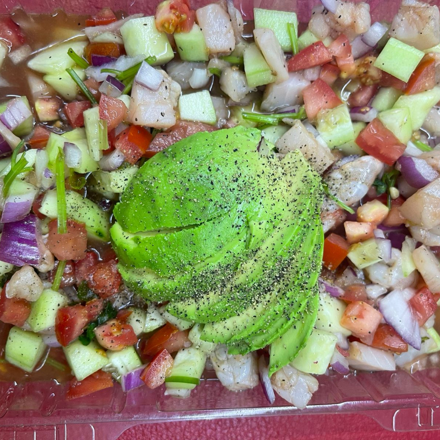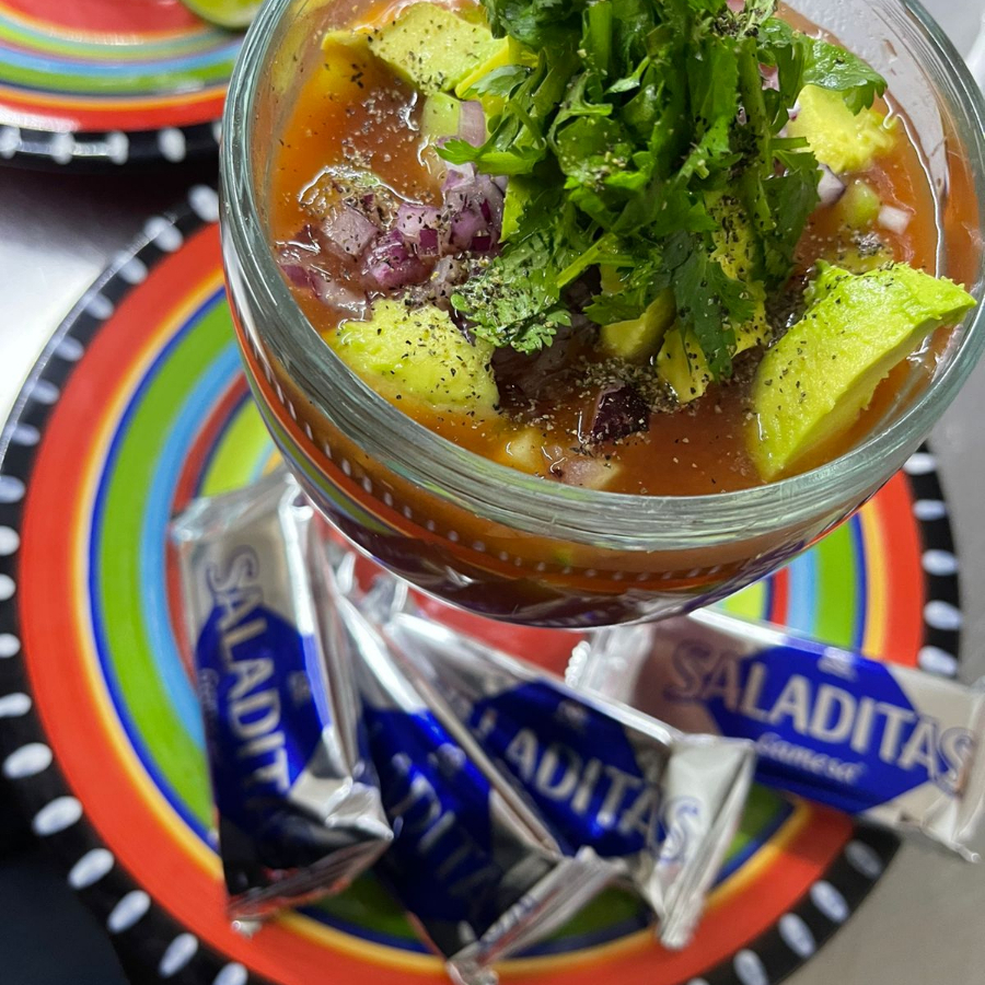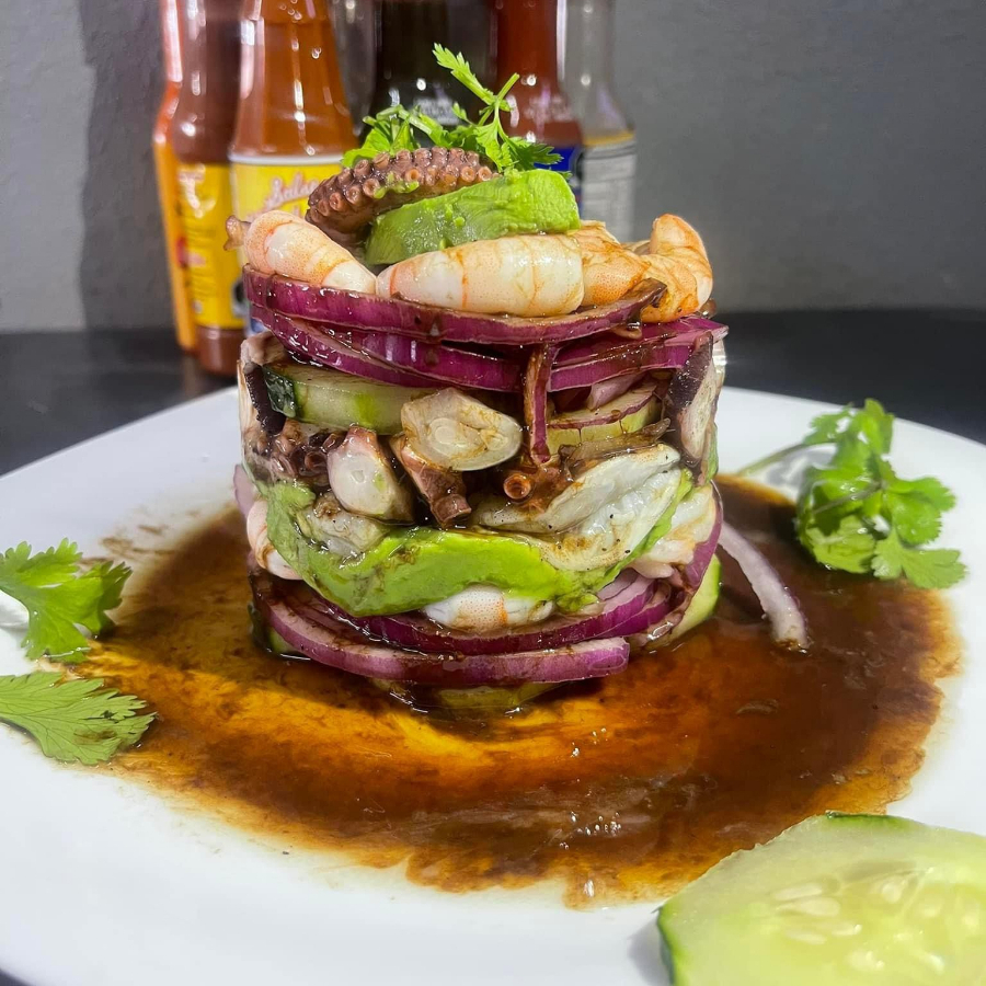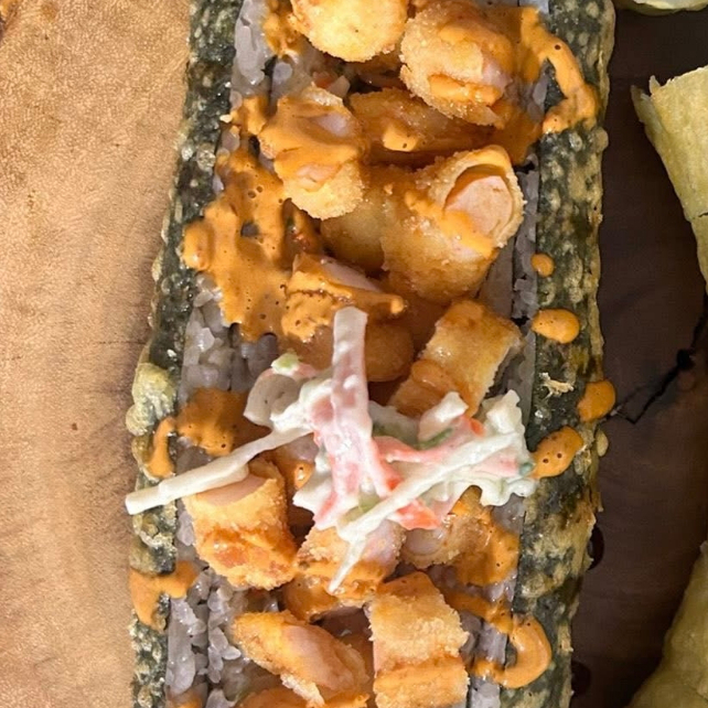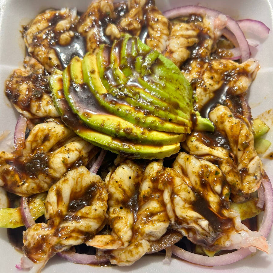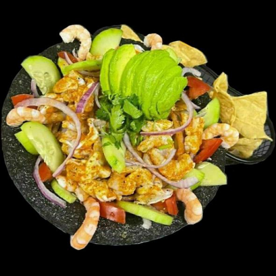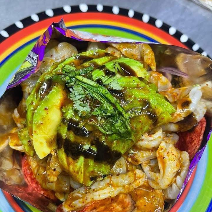 Camaron , aguacate , queso crema y una capa de chettos flaming hot arriba