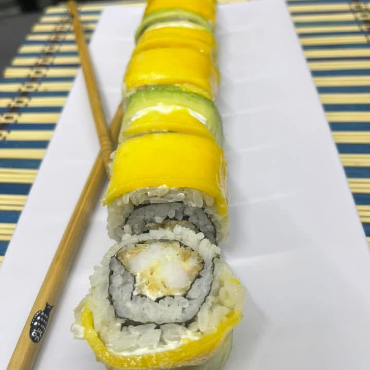Camaron al coco por dentro , aguacate , queso crema , una cama de mango natural por fuera y unas laminas de aguacate