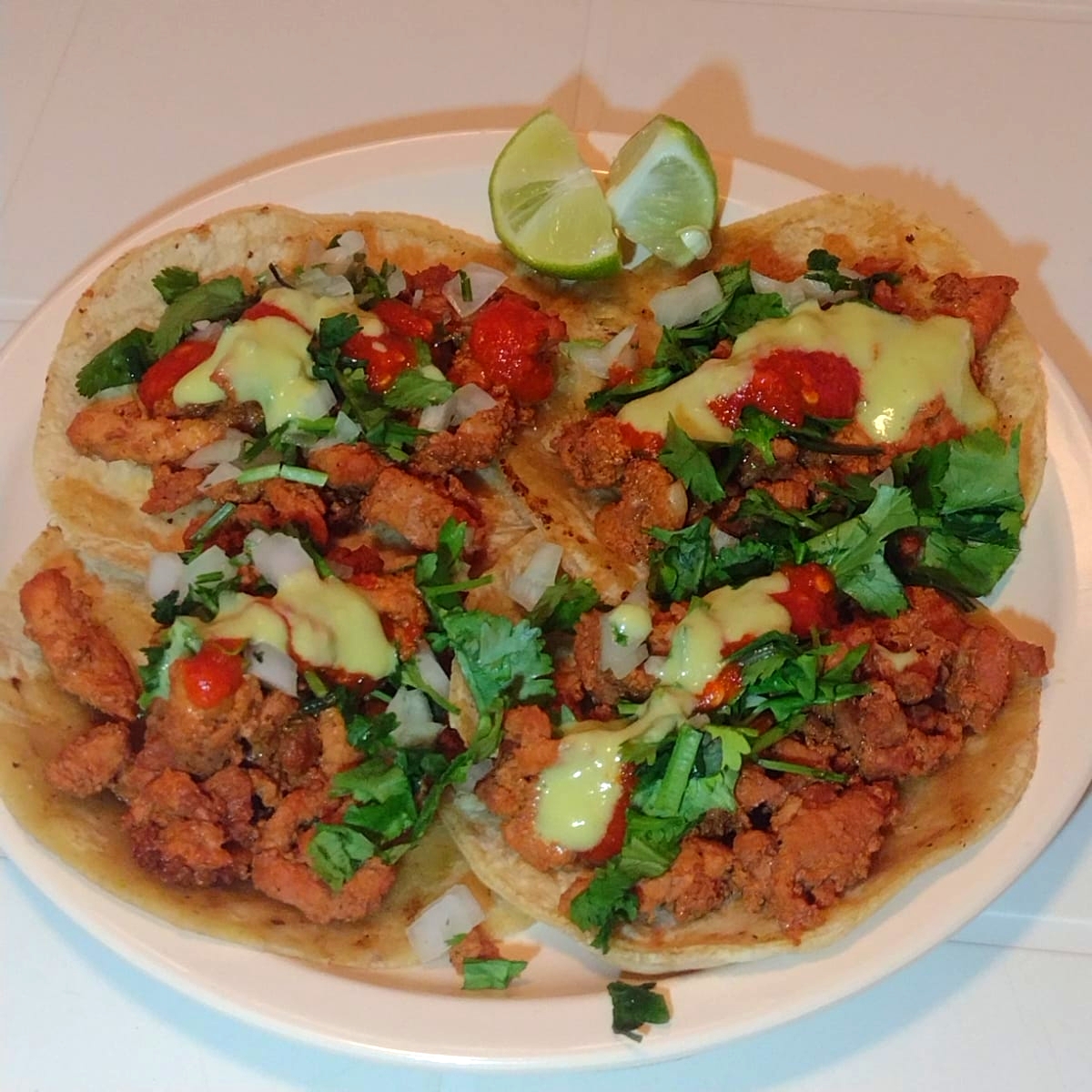 4 tacos de Pastor, Acompañado con Piña, Cilantro y Salsas.