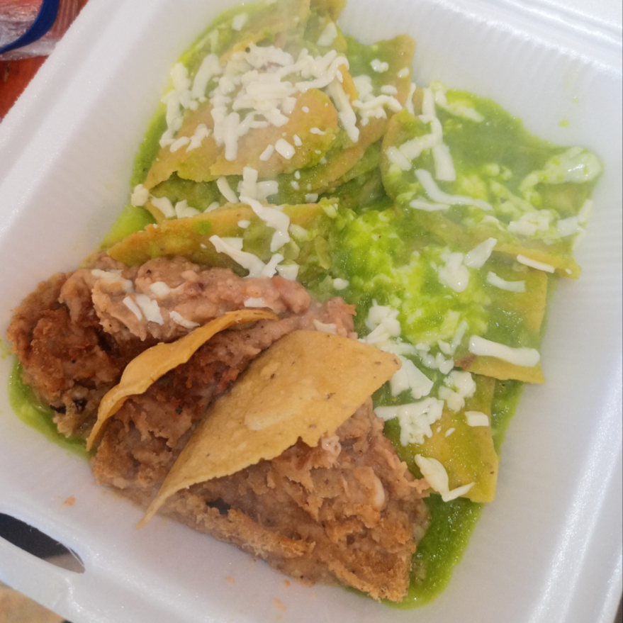 Ricos Chilaquiles en Salsa Verde con Crema, Cebolla y Cilantro, acompañados de Frijoles Refritos.