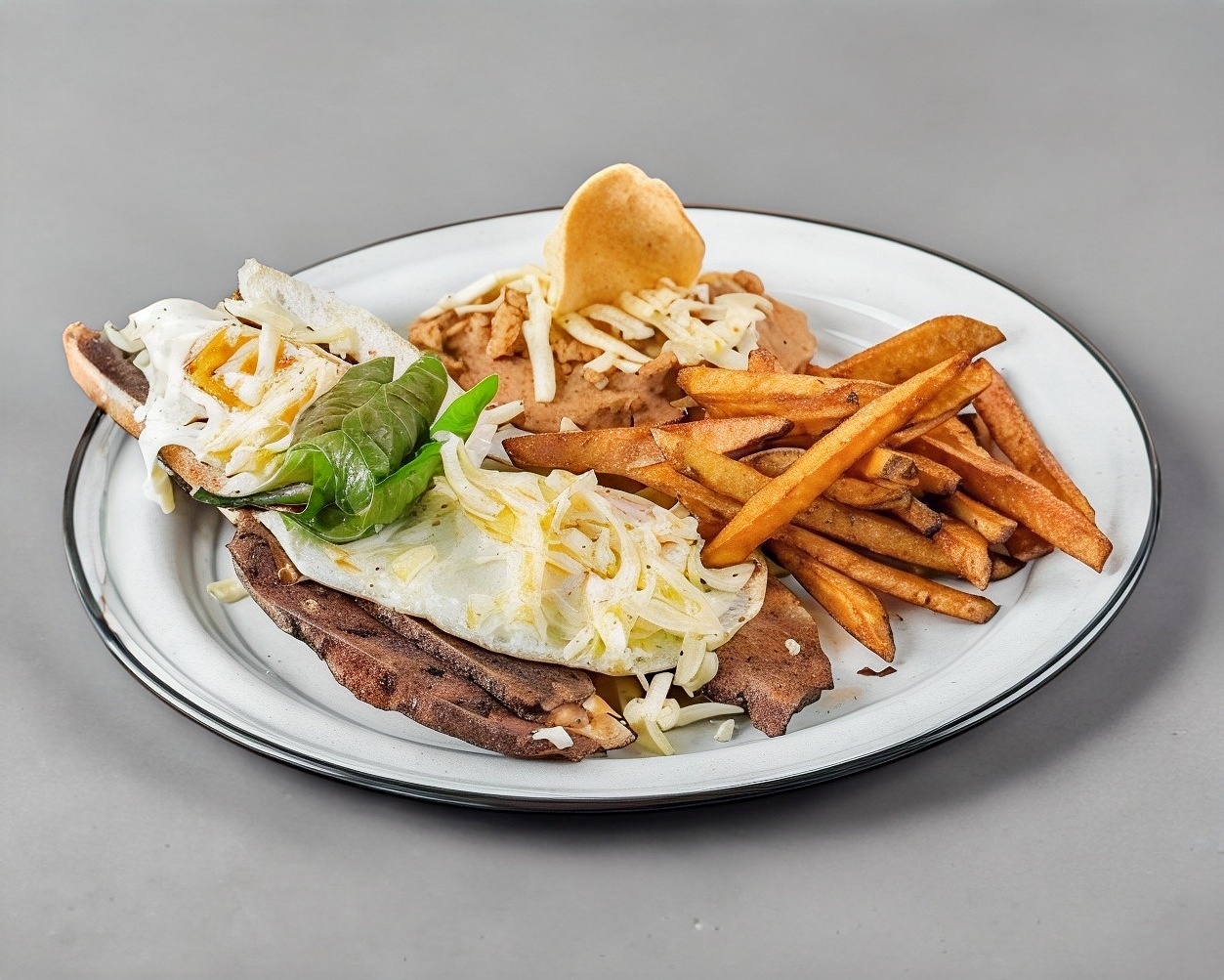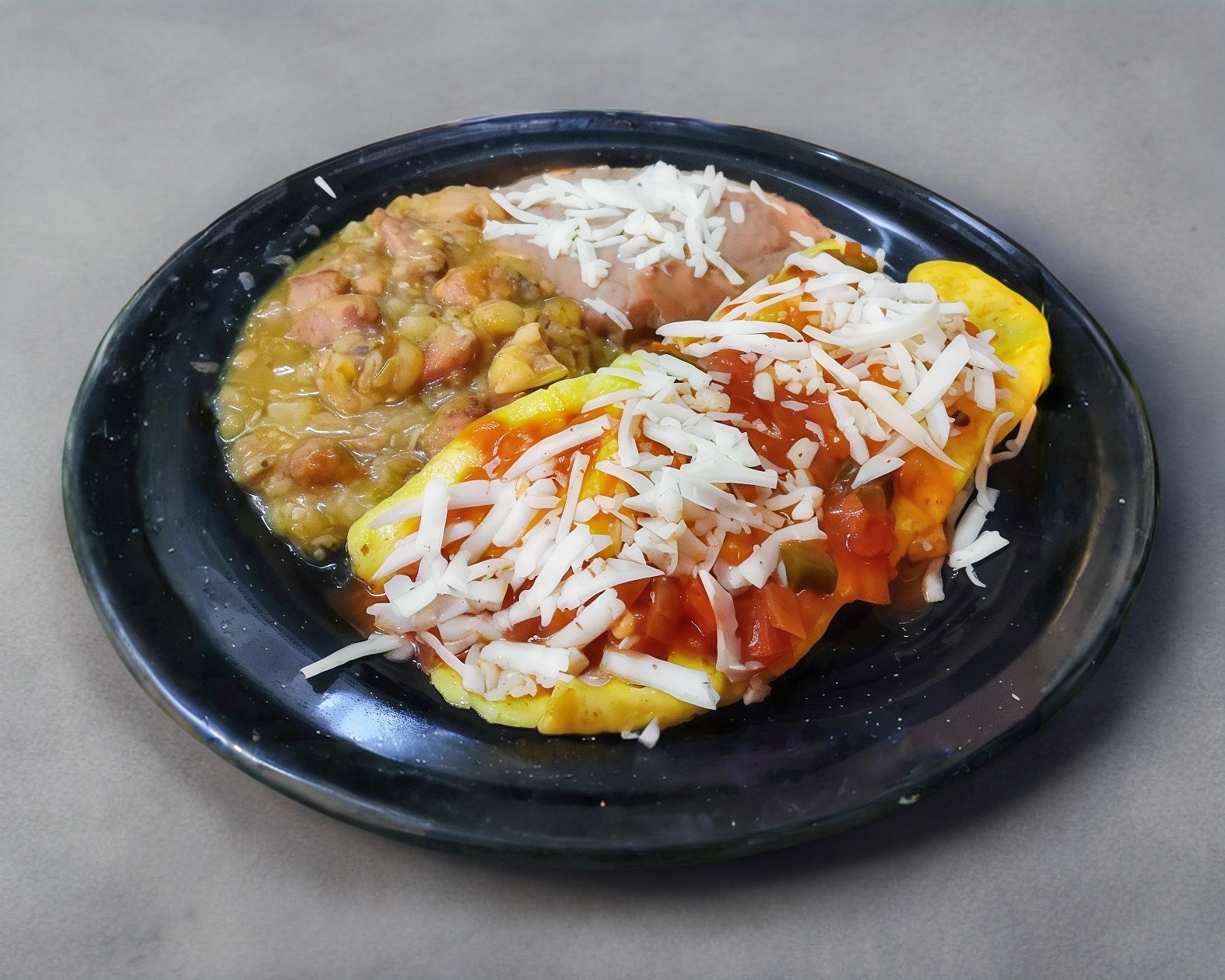 2 Huevos en tortilla frita con frijoles y jamón y 1 guisado.