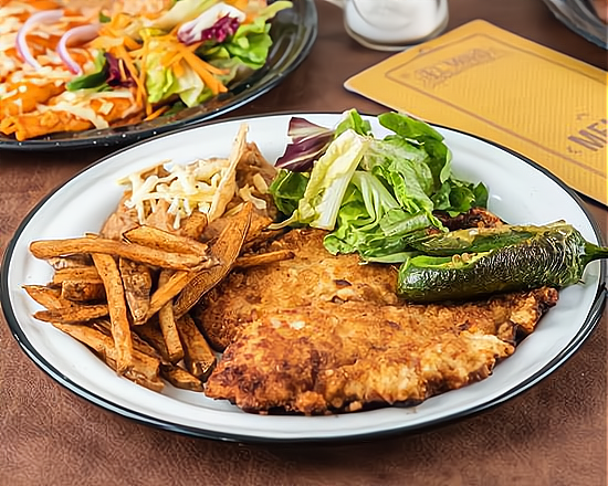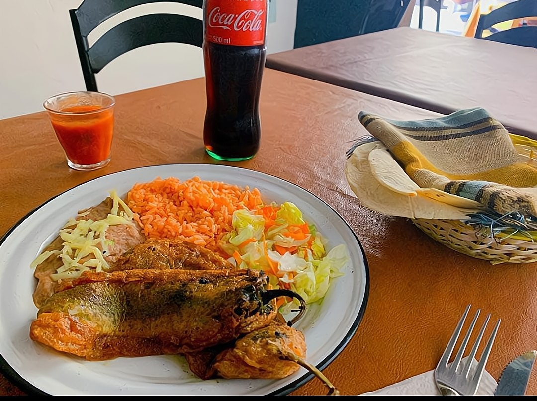 Opciones a elegir: relleno de deshebrada a la mexicana ó chile relleno bañada en salsa de la casa con 1 guisado y frijoles