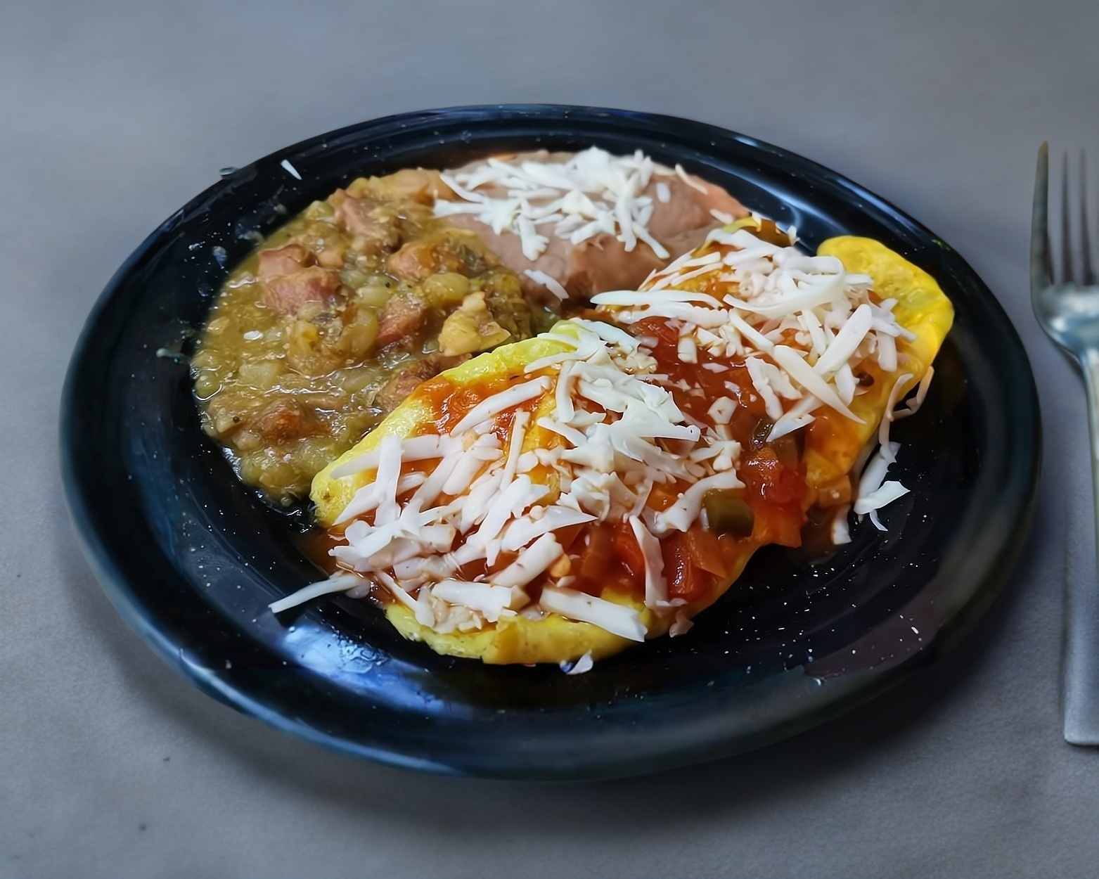 1 Ingrediente, guisado ,frijoles, salsa de la casa y queso gratinado.