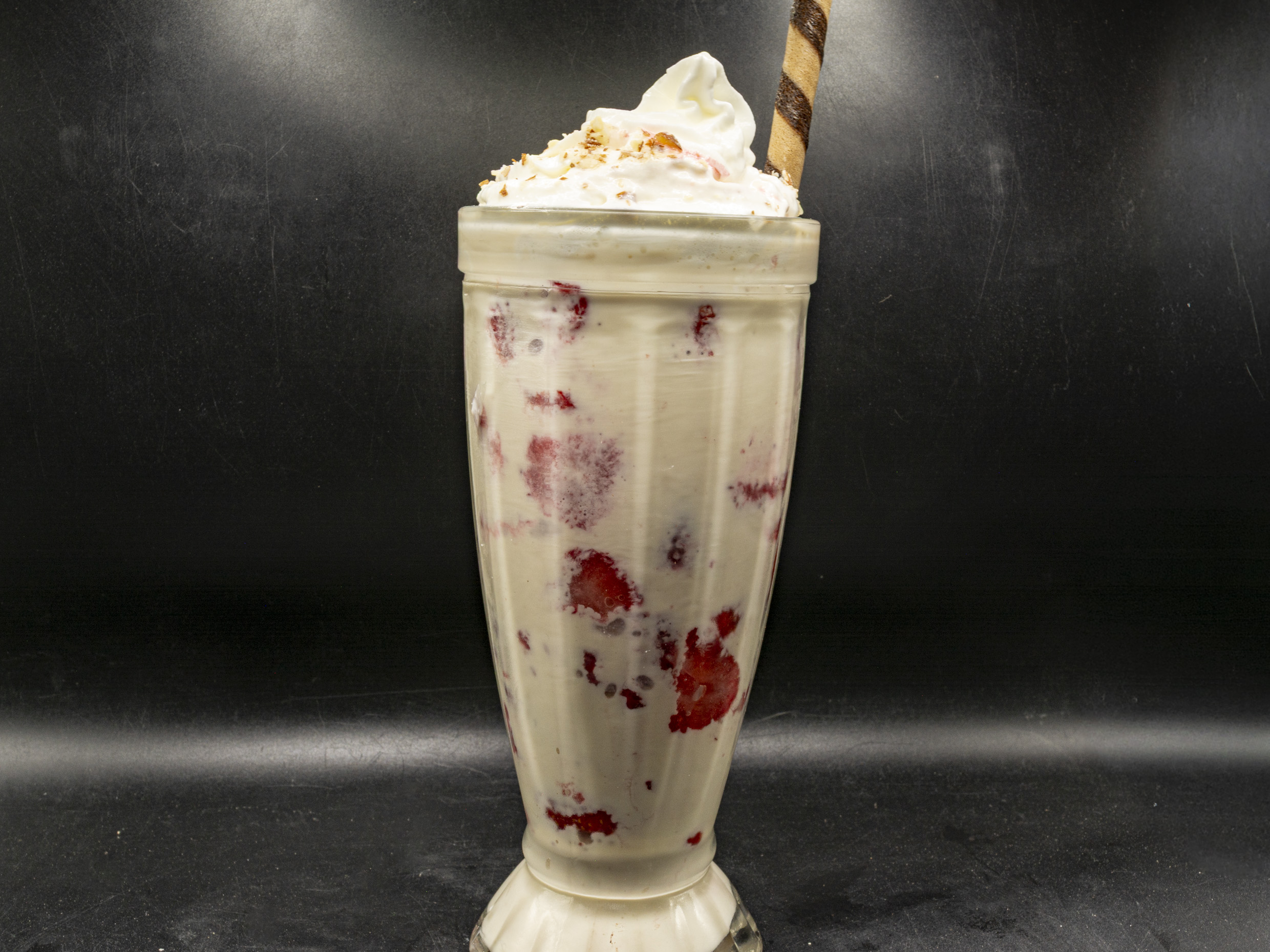 delicioso frape de cereza, crema batida, un baston de chocolate.