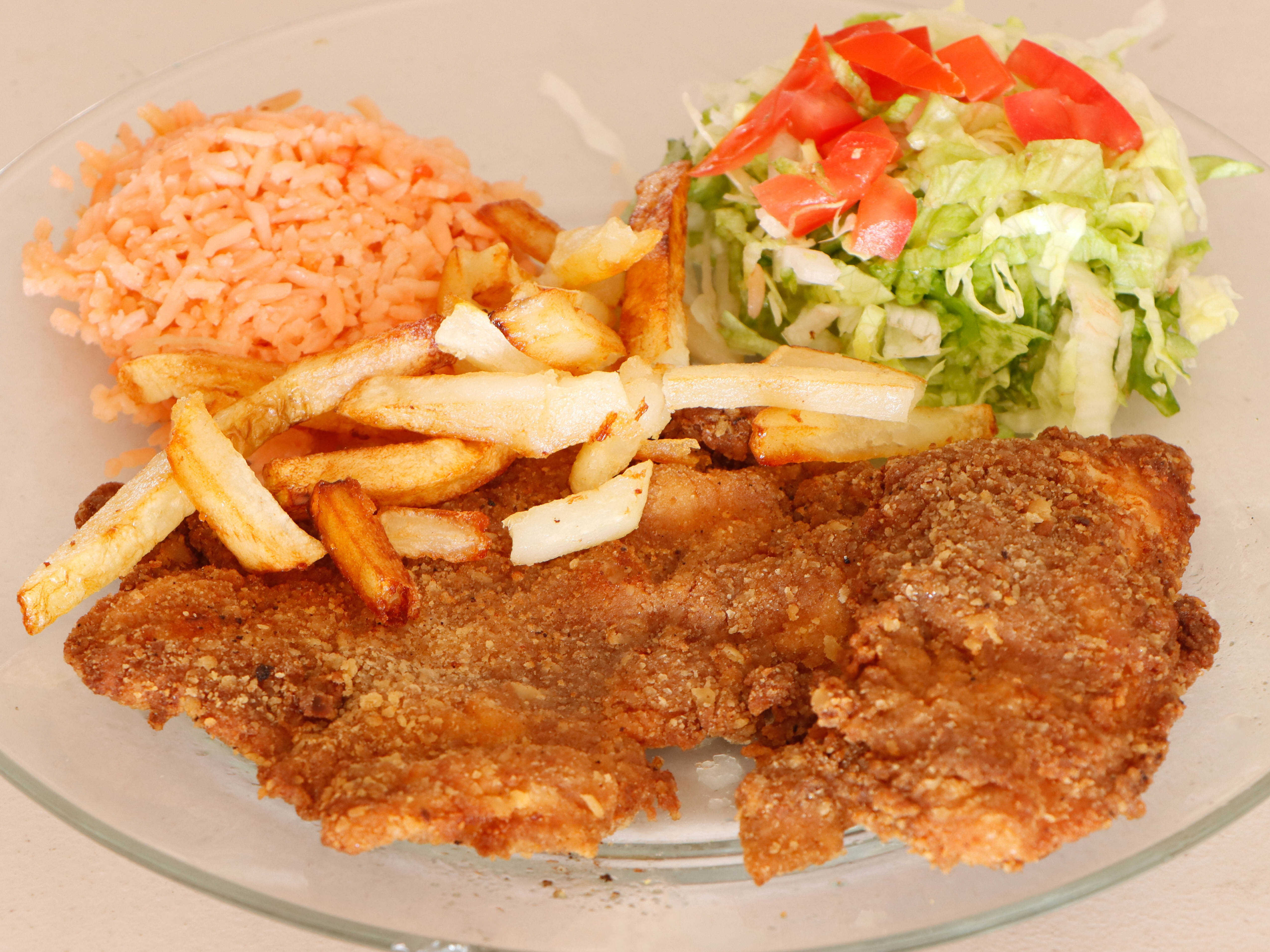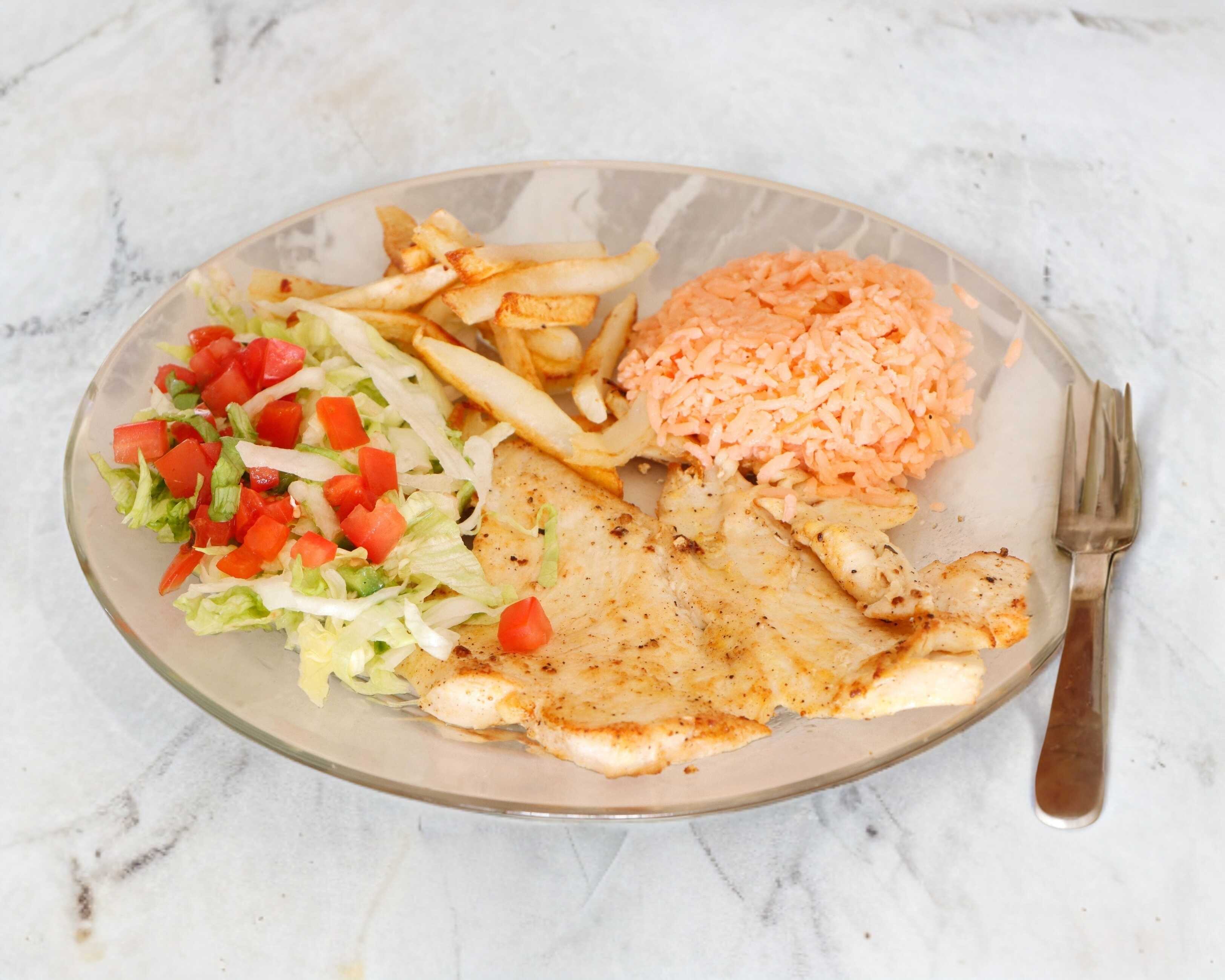 Acompañado por arroz, ensalada fresca y papas fritas.