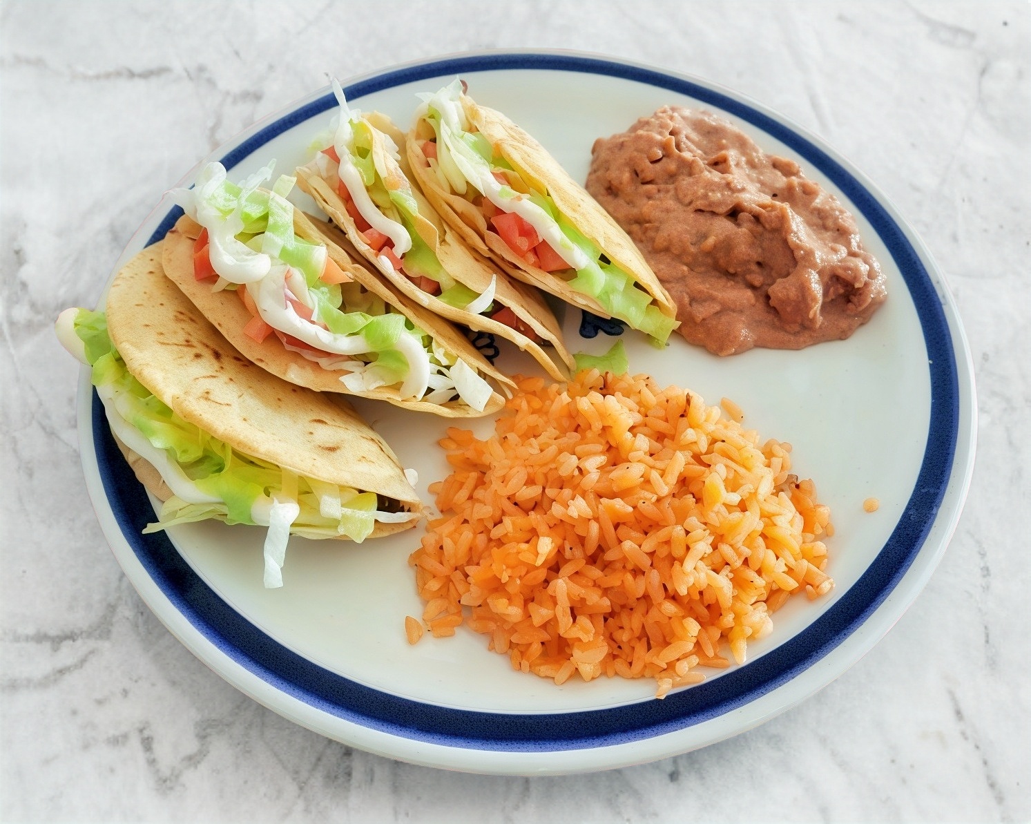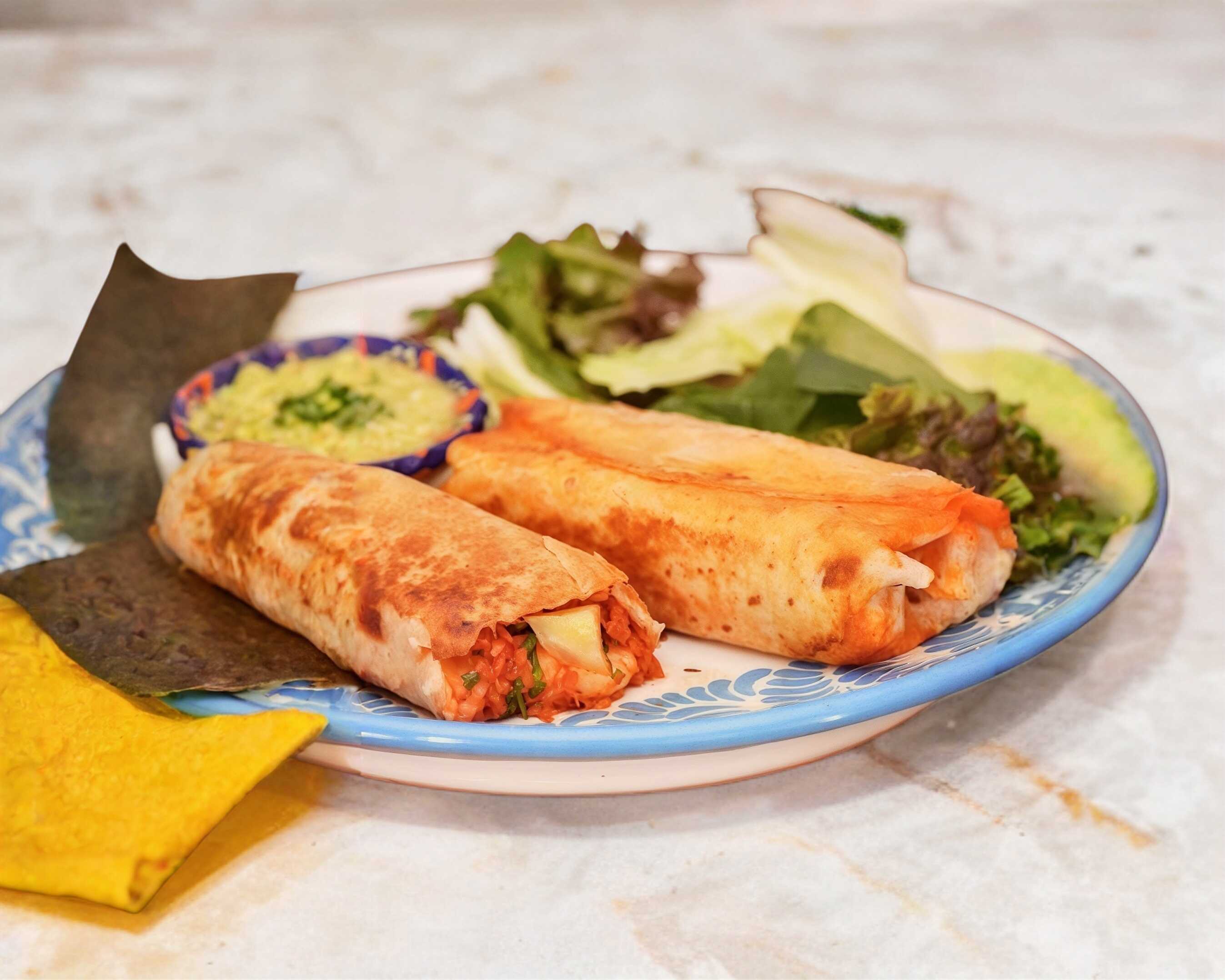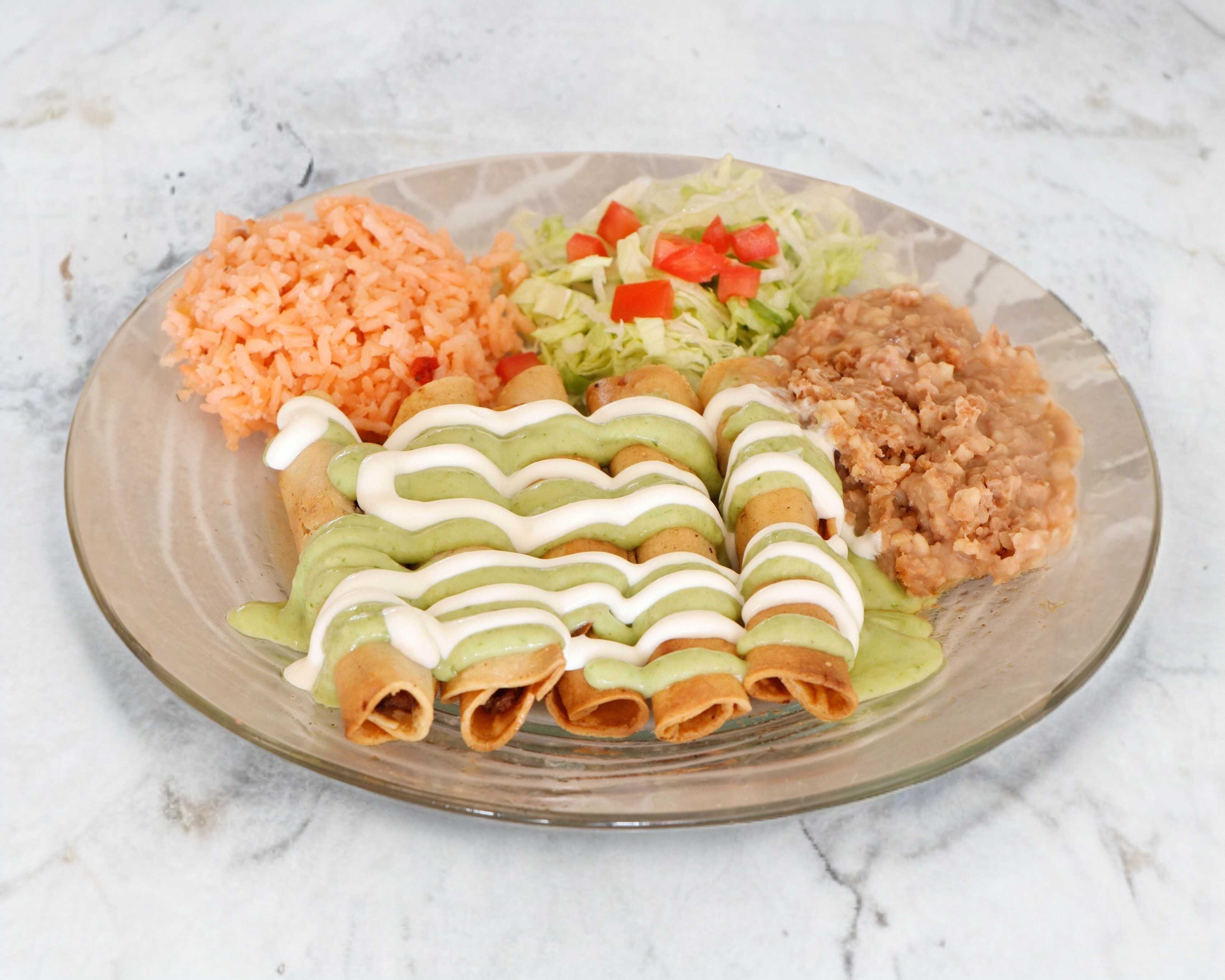 Orden de cinco flautas, acompañadas de arroz, ensalada fresca y frijoles.