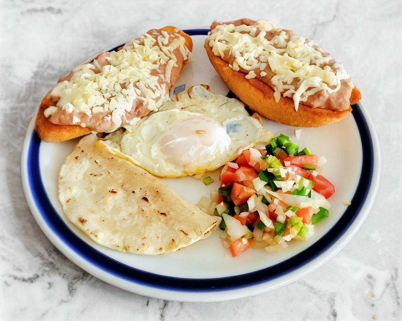 Un pan partido por la mitad con frijoles y queso, servido con un huevo estrellado y una quesadilla.