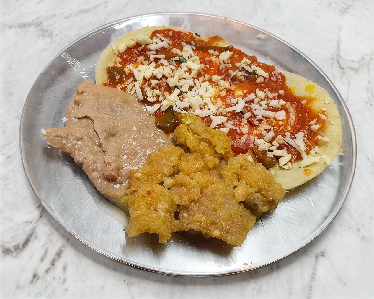 Chilaquiles Rojos o Verdes servidos con frijoles y guisado a elección.
