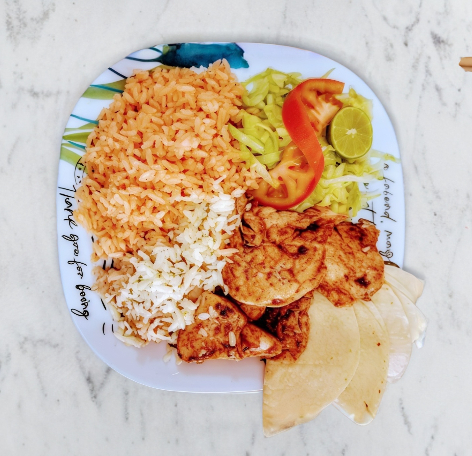 Pechuga a la plancha, verdura, arroz y frijoles con queso